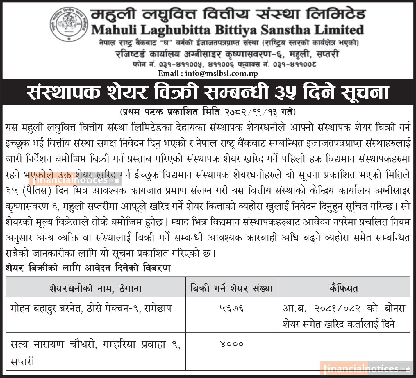संस्थापक शेयर बिक्री सम्बन्धी ३५ दिने सूचना