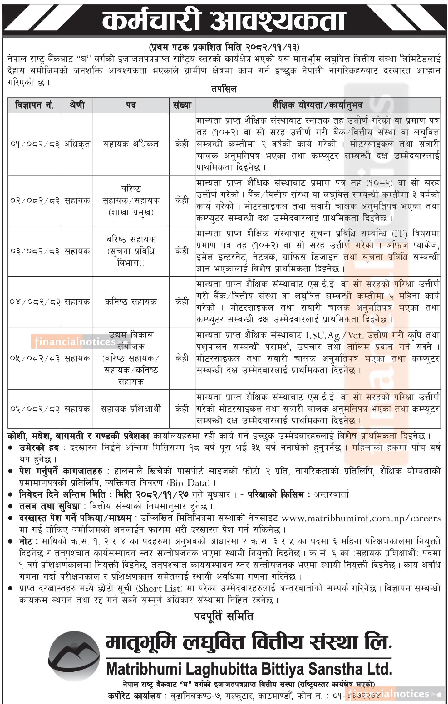 Kathmandu: Matribhumi Laghubitta Bittiya Sanstha Ltd., a national-level microfinance institution licensed as a “D” class financial institution by Nepal Rastra Bank, has announced vacancies for various positions. The institution is seeking applications from qualified and motivated Nepali citizens who are willing to work in rural areas.