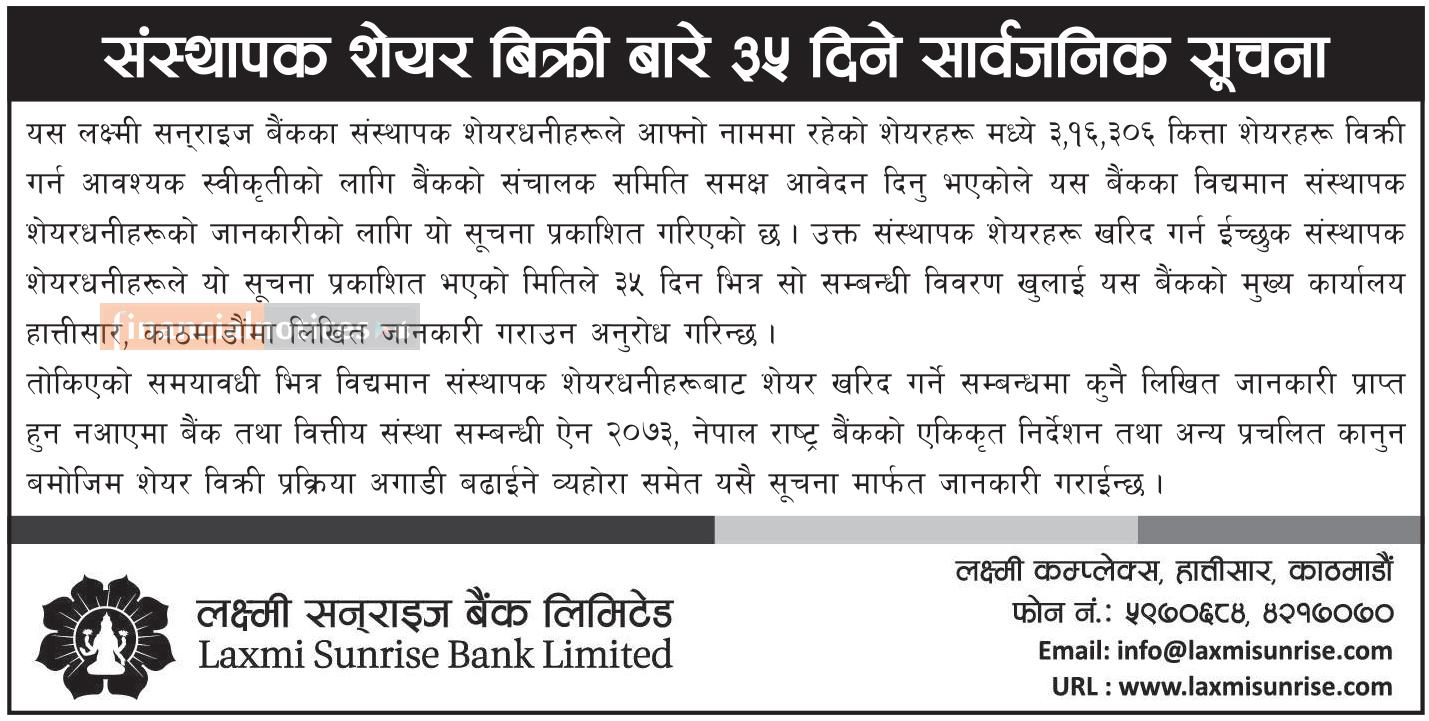 लक्ष्मी सनराइज बैंक लिमिटेडमा संस्थापक शेयर खरिद गर्न ३५ दिनभित्र निवेदन दिन आह्वानको सूचना