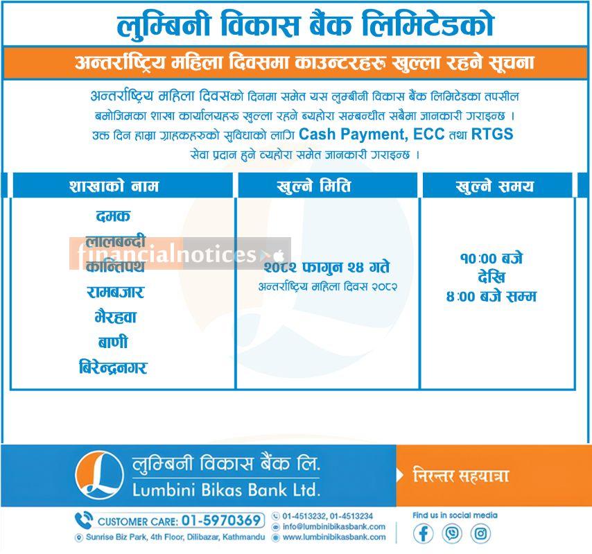 अन्तर्राष्ट्रिय महिला दिवसका दिन लुम्बिनी विकास बैंकका शाखा सञ्चालन समय सम्बन्धी सूचना