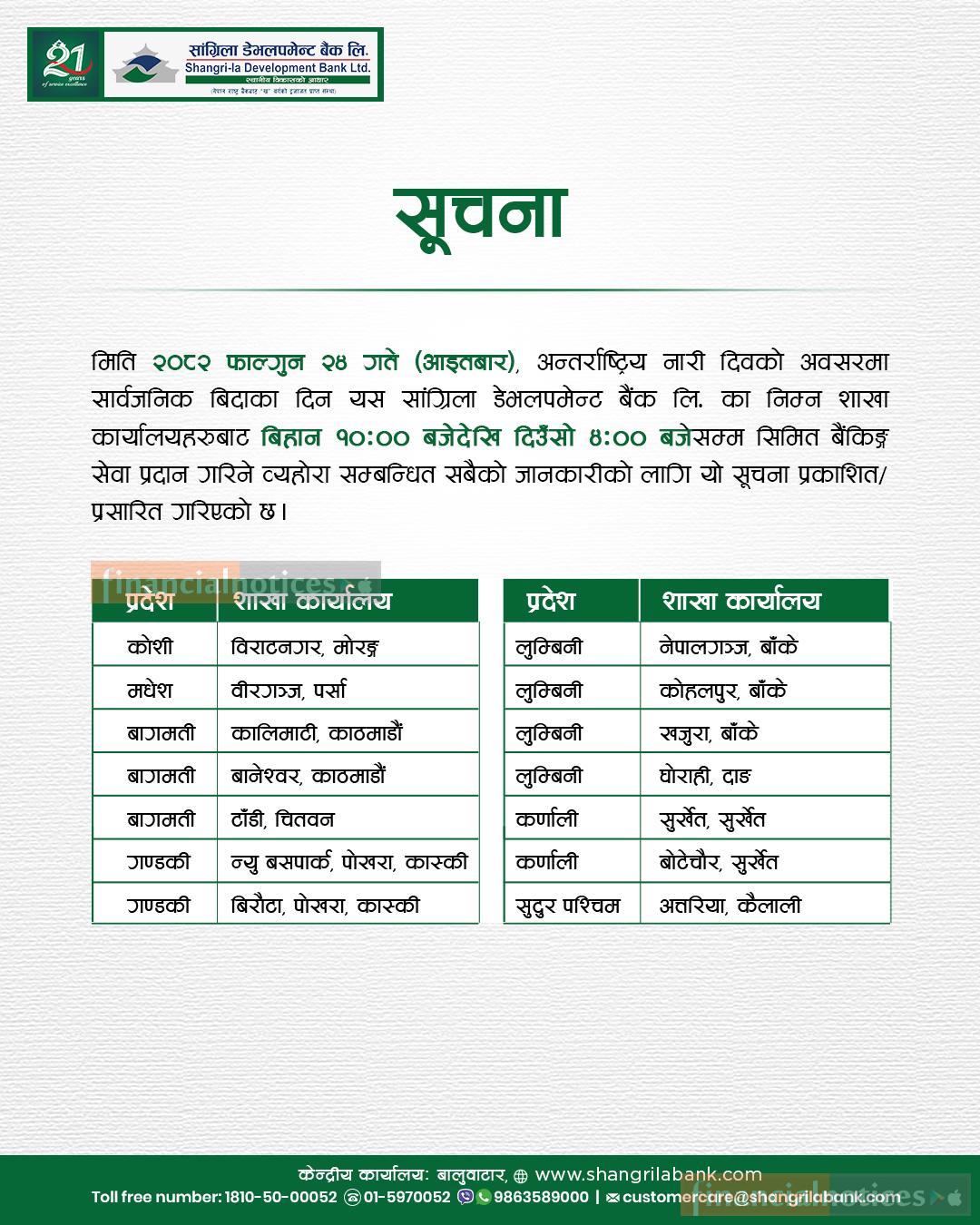 होलीडे काउन्टर सञ्चालन सम्बन्धी सांग्रीला डेभलपमेन्ट बैंकको सूचना -