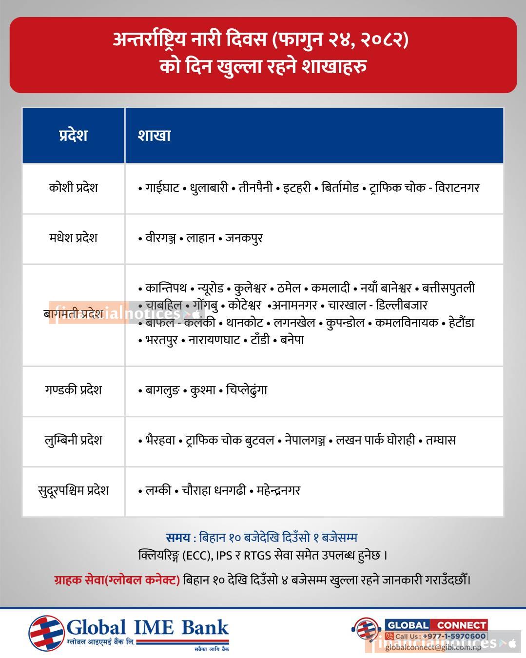 अन्तर्राष्ट्रिय नारी दिवसमा ग्लोबल आइएमई बैंकको शाखाहरु खुल्ला रहने सूचना