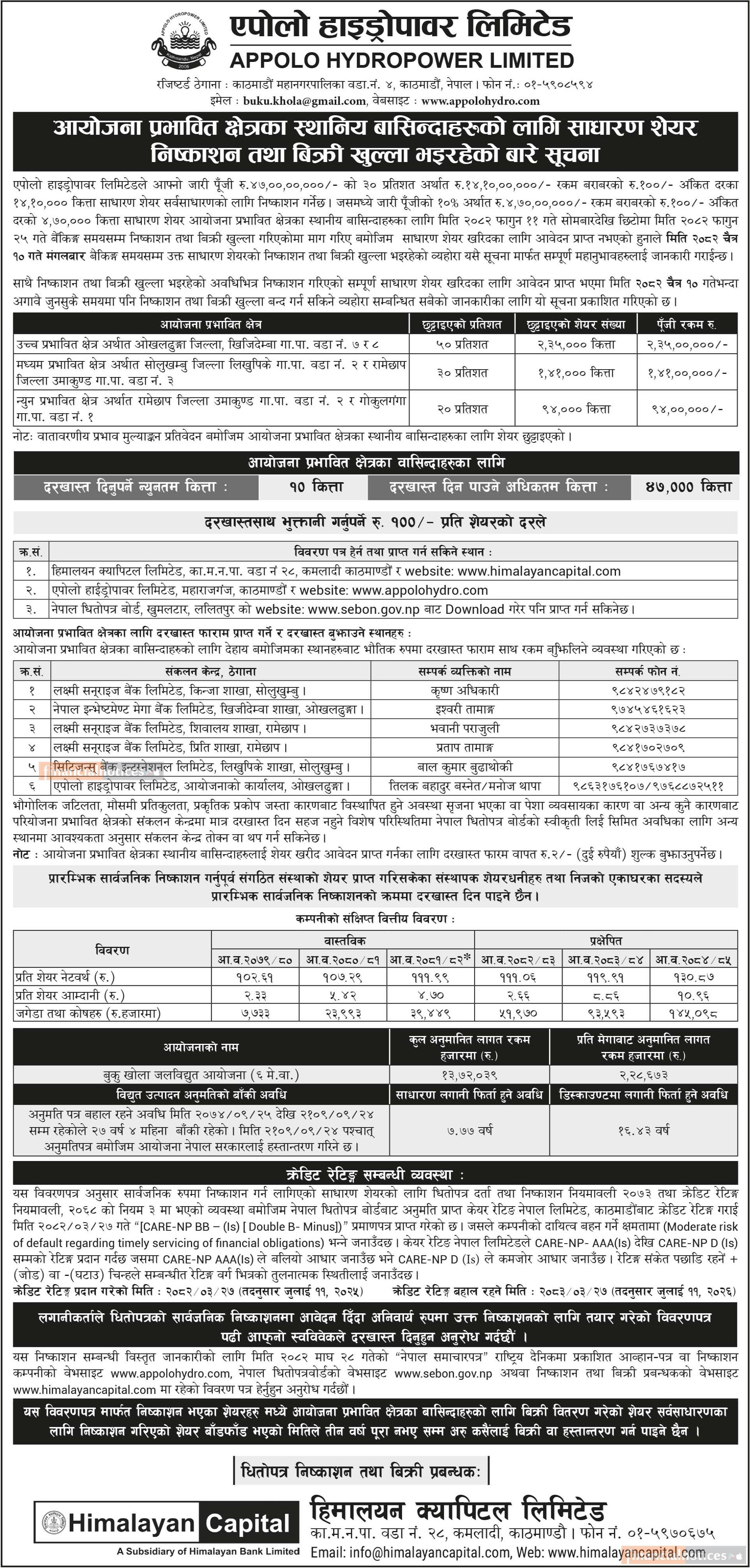 एपोलो हाइड्रोपावरको साधारण शेयर निष्काशन तथा बिक्री खुल्ला सम्बन्धी सूचना