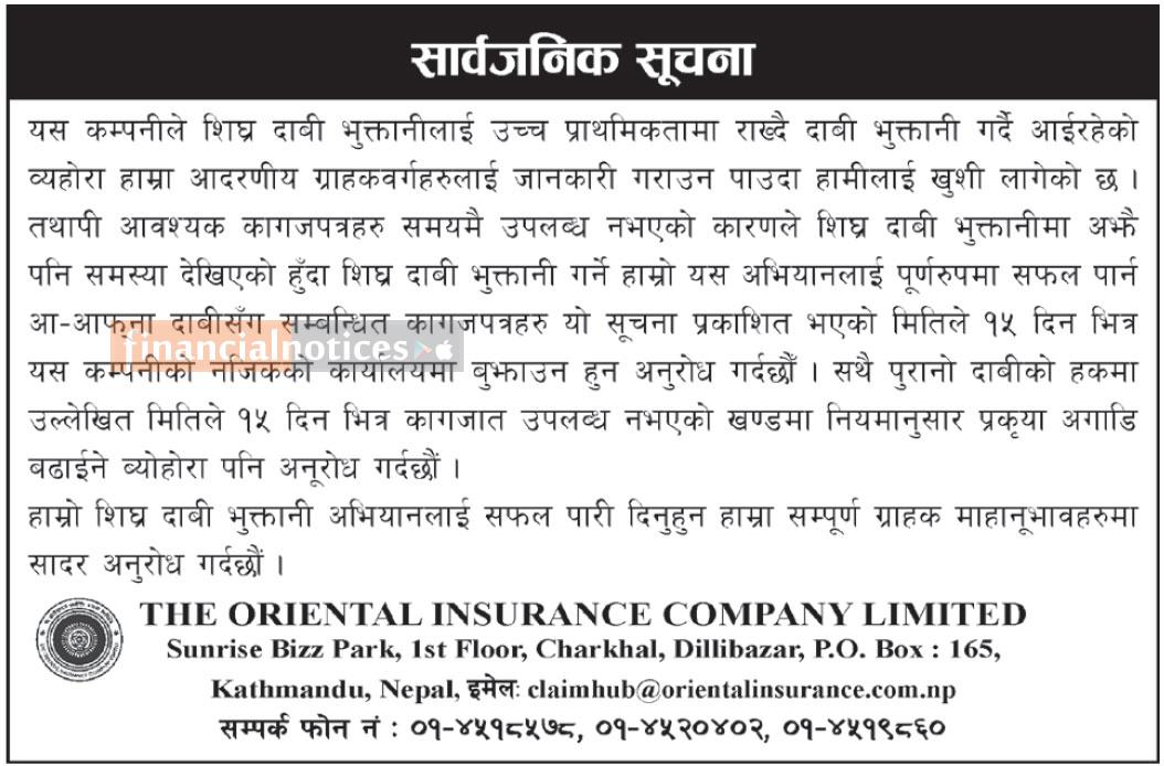 पुराना दाबीसम्बन्धी कागजात १५ दिनभित्र पेश गर्न ओरिएन्टल इन्स्योरेन्सको अनुरोध सम्बन्धी सूचना
