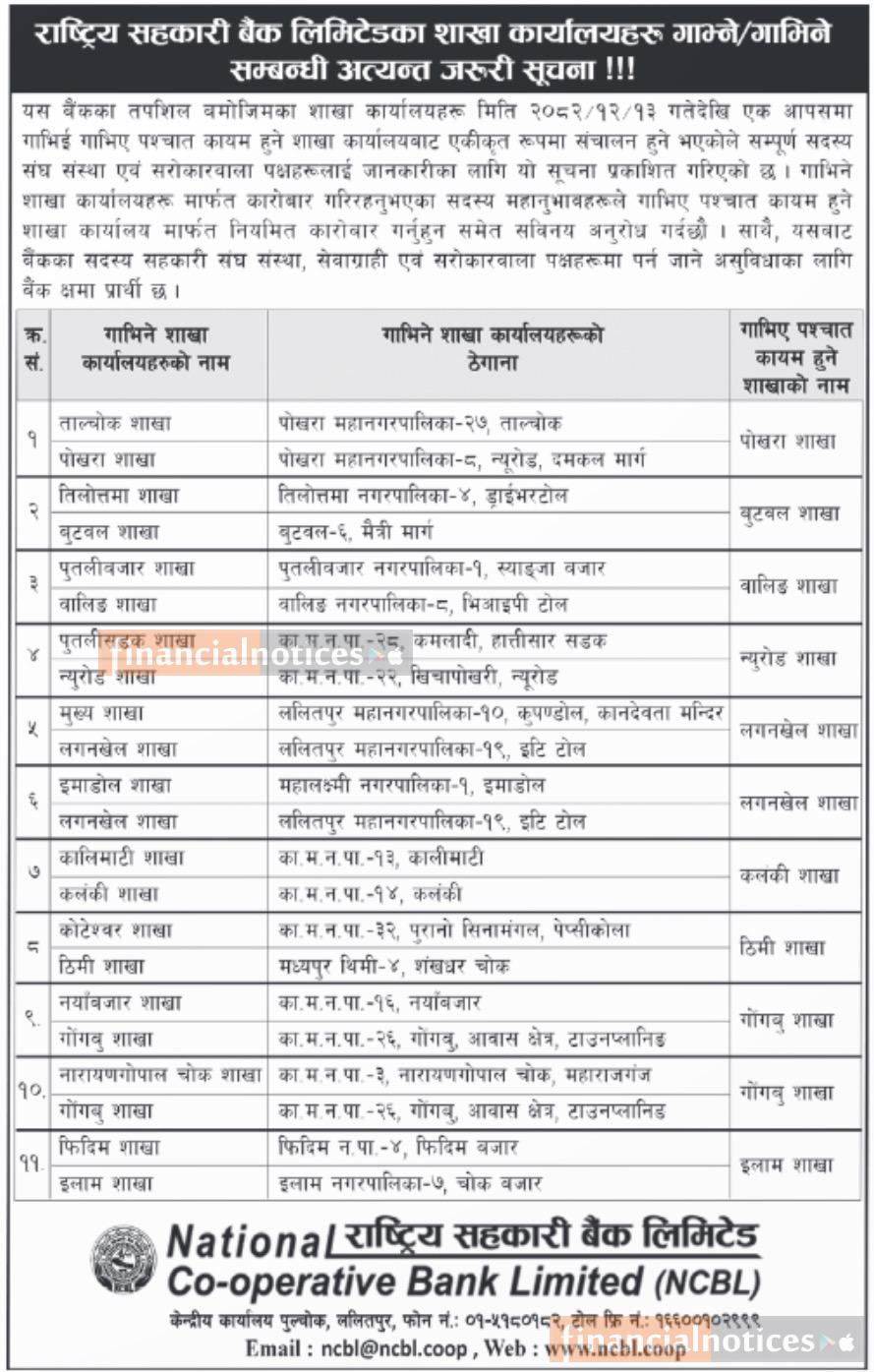 राष्ट्रिय सहकारी बैंकका शाखा कार्यलयहरु गाभिने सम्बन्धी सूचना