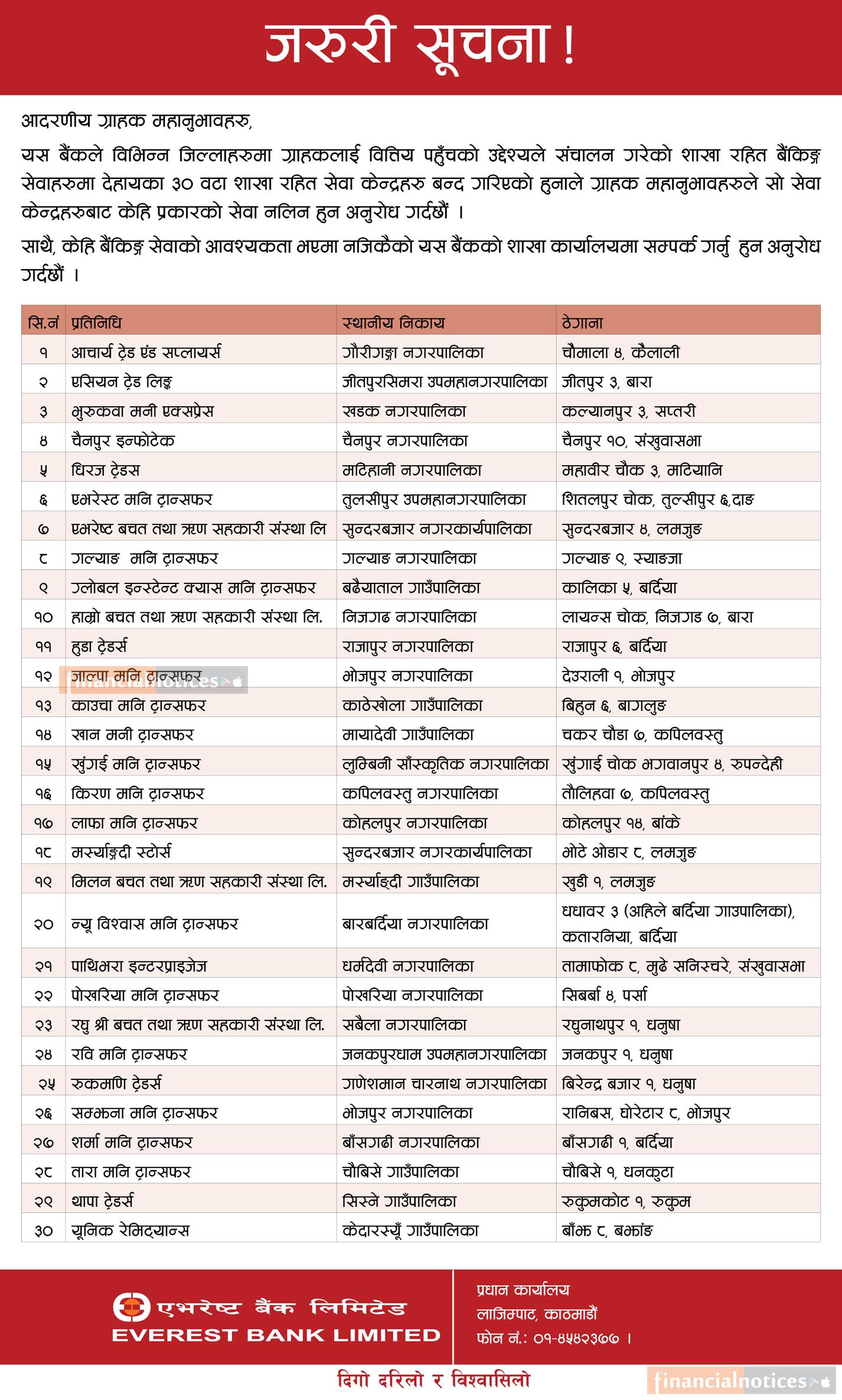 Everest Bank Limited has informed its valued customers that 30 branchless banking service counters operating in different districts have been closed as part of the bank’s service management and accessibility adjustments. Customers who were previously using these counters are requested to use the nearest available branchless banking outlets for their transactions. For any additional banking services or assistance, customers are advised to contact the nearest branch office of the