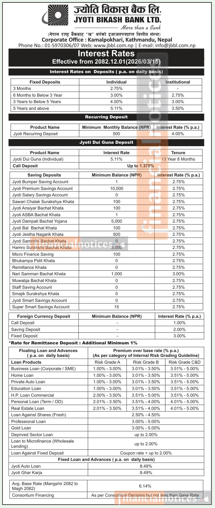 Jyoti Bikas Bank has released its revised interest rates, effective from 1st Poush 2082 (15th December 2025). The updated rates apply to Deposits, Recurring Deposits, and Loans. Customers are advised to review the new rates for their saving and borrowing plans.