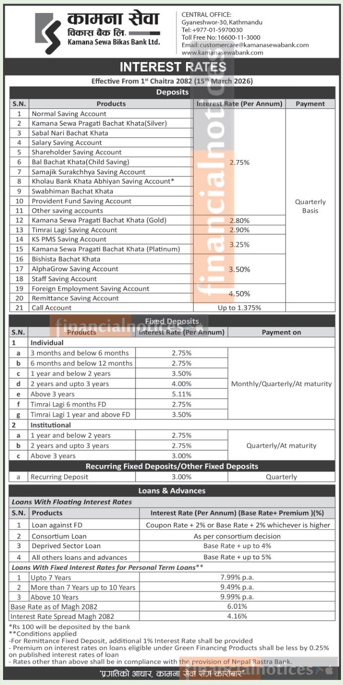 Kamana Sewa Bikas Bank has released its revised interest rates, effective from 1st Chaitra 2082 (15th March 2026). The updated rates apply to all Deposits as well as Loans and Advances. Customers are advised to review the new rates for their saving and borrowing decisions.