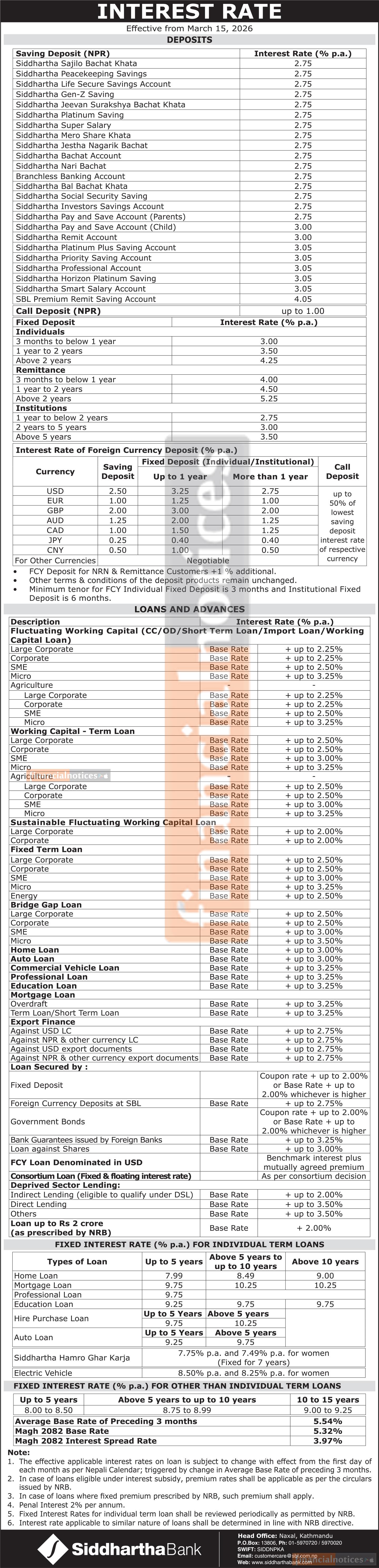 Siddhartha Bank has announced its revised interest rates, effective from 1st Chaitra 2082 (15th March 2026). The updated rates cover Savings Deposits, Call Deposits, Fixed Deposits, and all Loans and Advances. Customers are advised to review the new rates to plan their savings and borrowing efficiently.