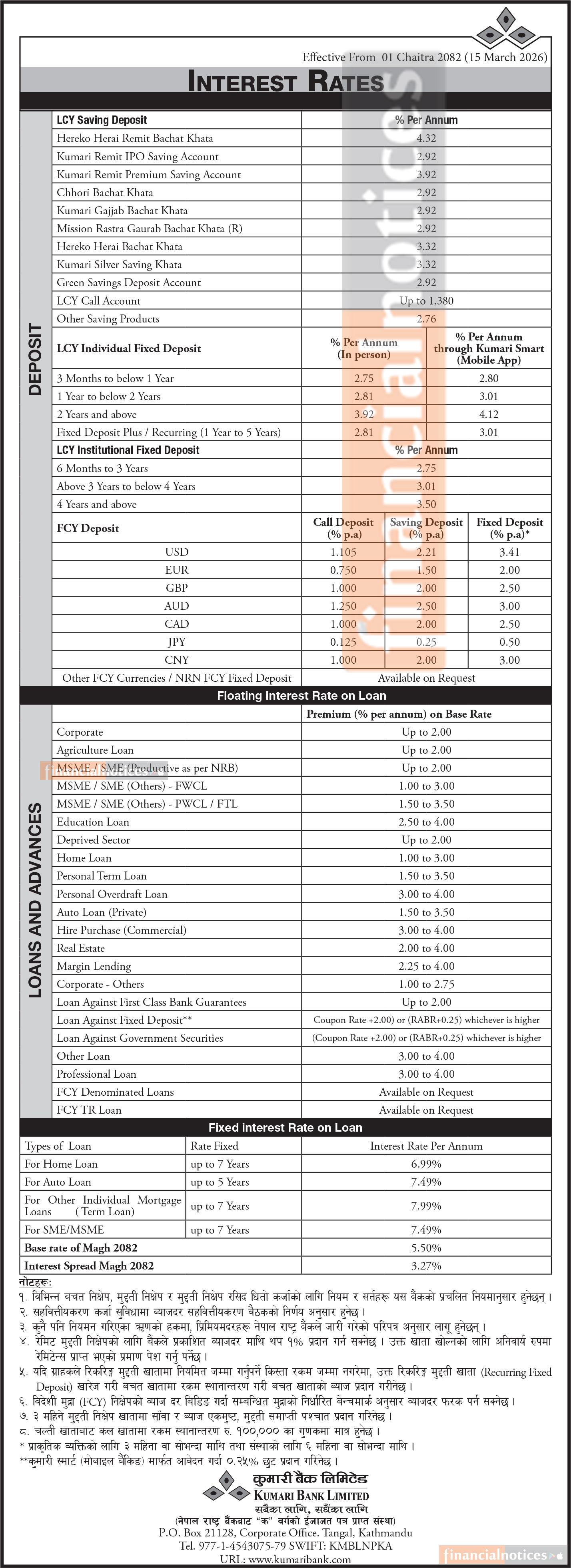 Kumari Bank has released its revised interest rates, effective from 1st Chaitra 2082 (15th March 2026). The updated rates cover Savings Deposits and Floating Interest Rates on Loans. Customers are encouraged to check the new rates for informed saving and borrowing decisions.