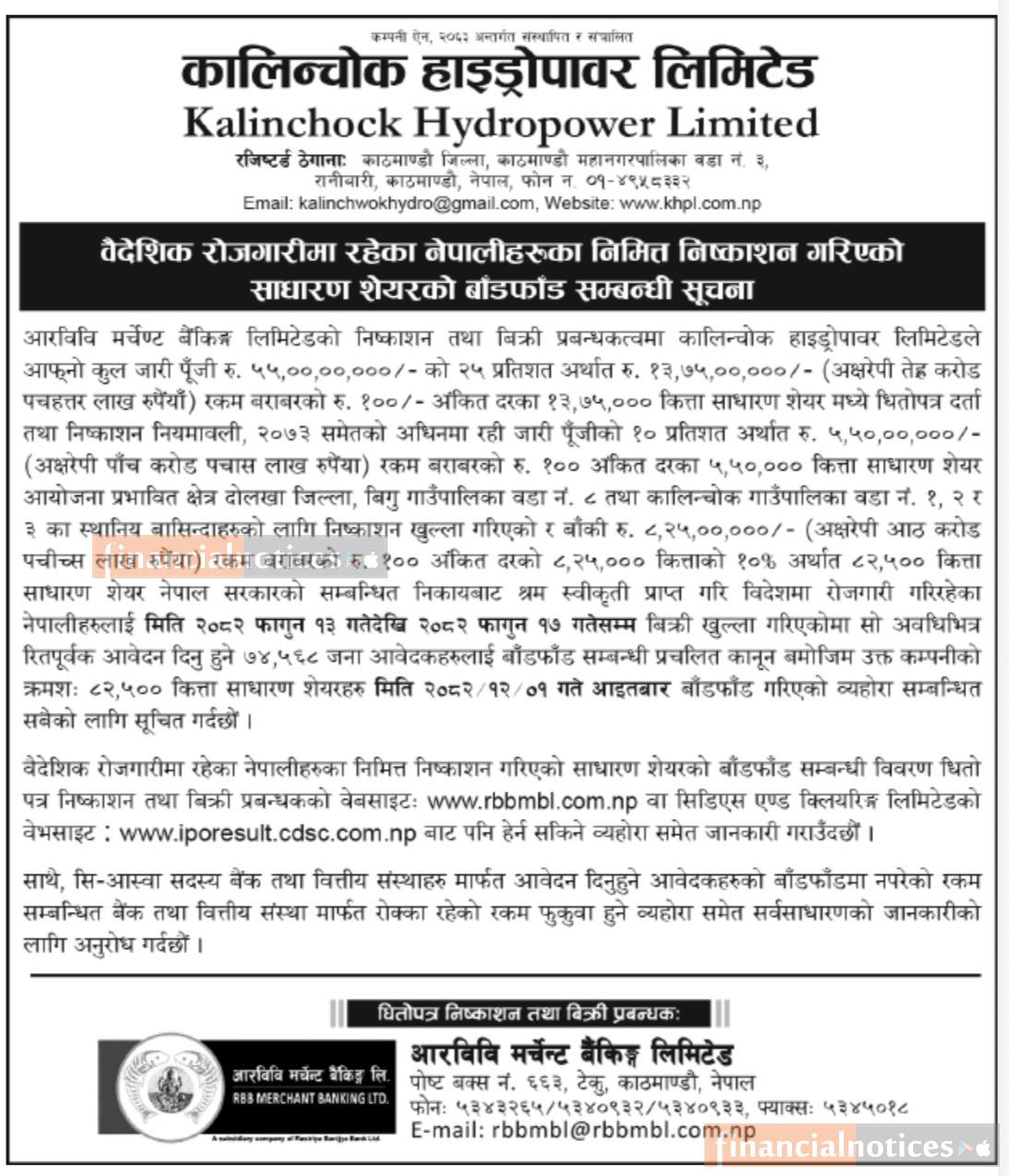 कालिनन्चोक हाइड्रोपावरको साधानण सेयर IPO बाँडफाँड सम्बन्धी सूचना