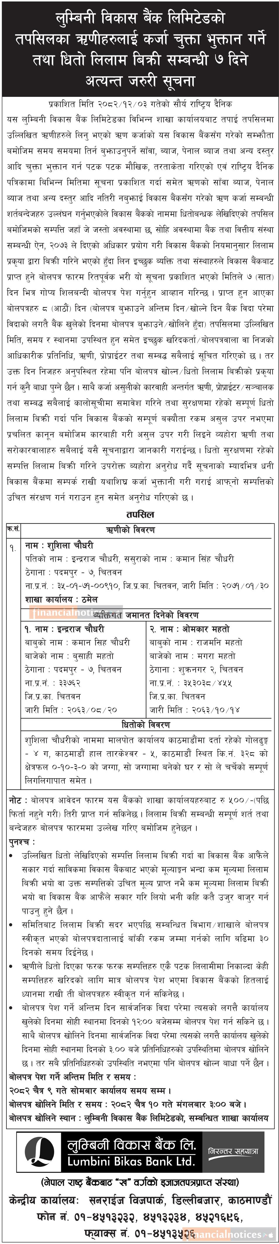 लुम्बिनी विकास ऋणीहरुलाई कर्जा चुक्ता भुक्तान गर्ने तथा धितो लिलाम बिक्रीको सूचना -