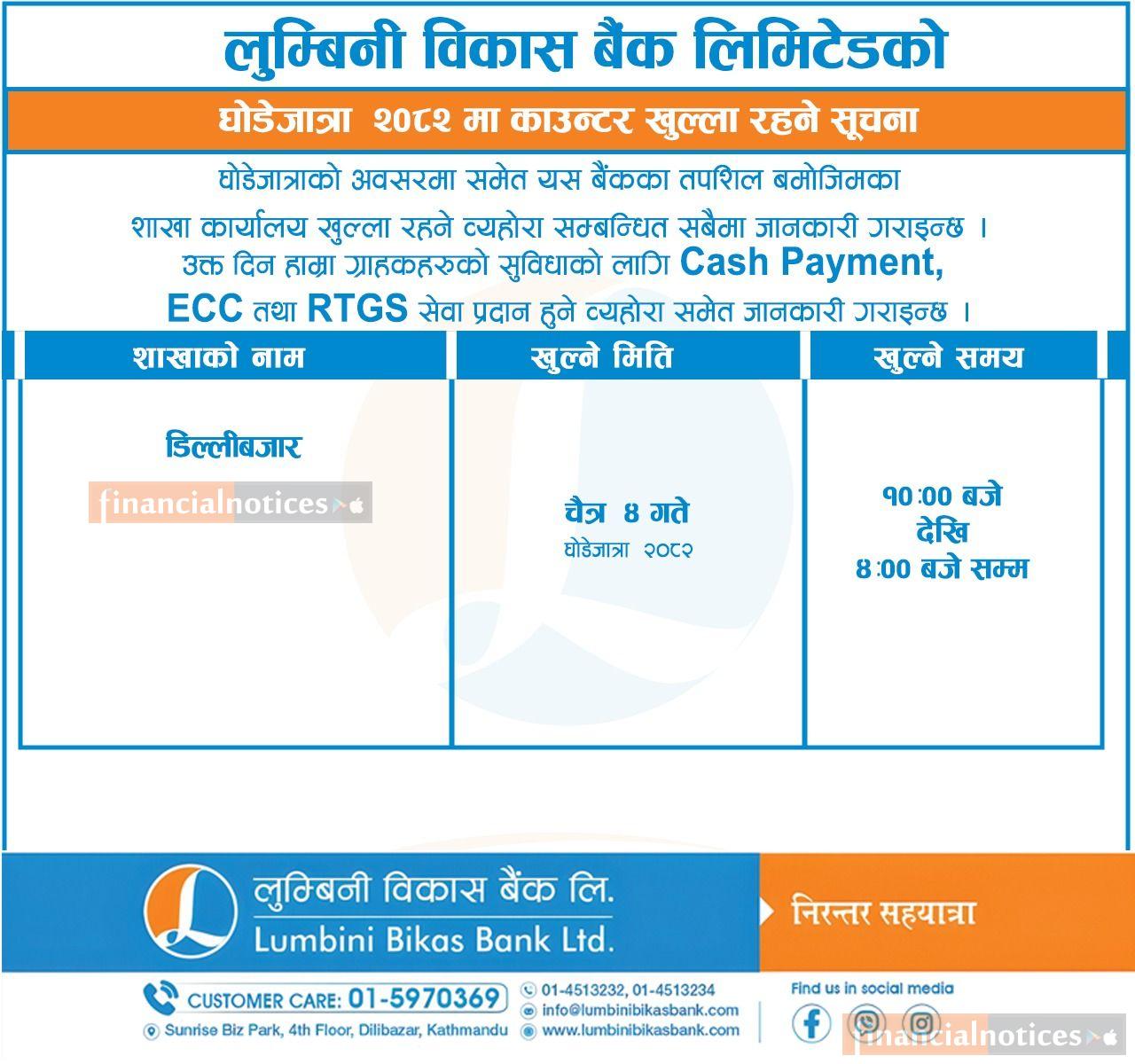 घोडेजात्राको दिनलुम्बिनी विकास बैंकका काउण्टर खुल्ला रहने सम्बन्धी सूचना