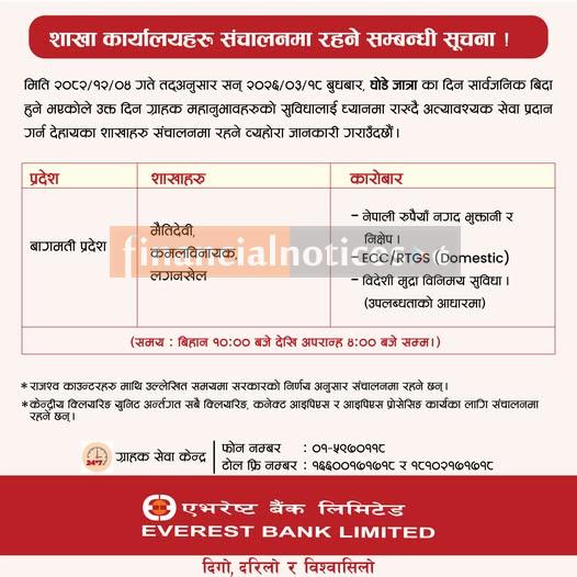 एभरेष्ट बैंकको शाखा कार्यालयहरू खुल्ला रहने सम्बन्धी सूचना