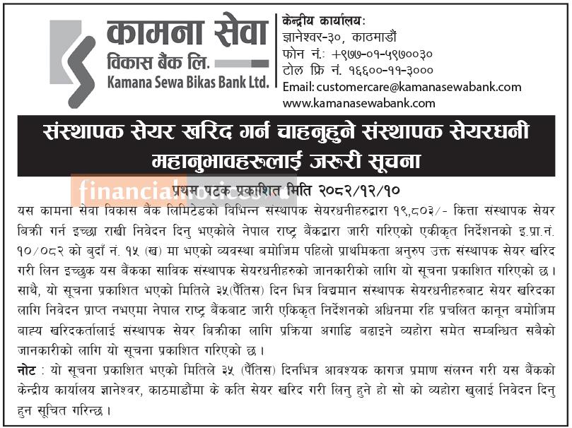कामना सेवा विकास बैंकका संस्थापक सेयर बिक्री प्रक्रिया सम्बन्धी सार्वजनिक सूचना