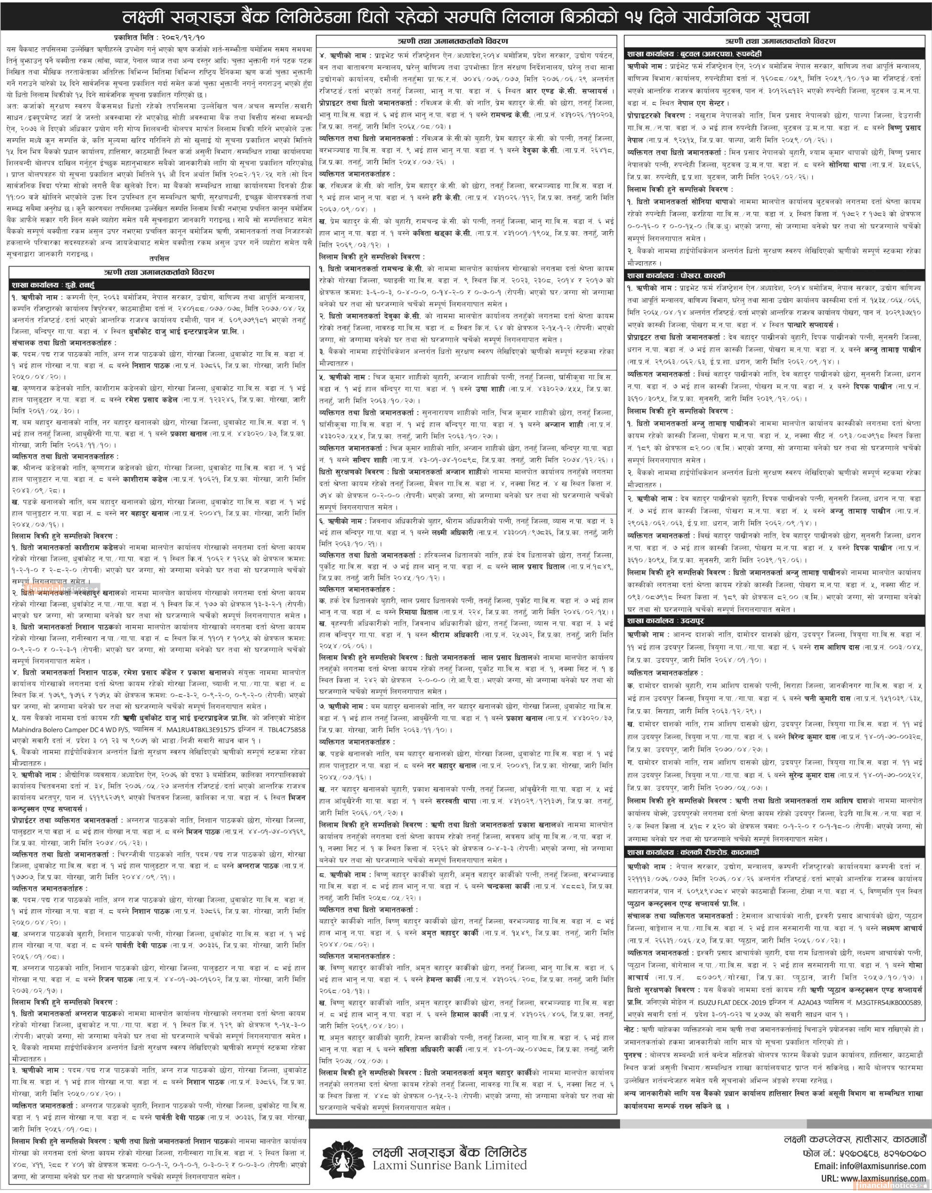 लक्ष्मी सनराइज बैंकमा धितो रहेको सम्पत्ति लिलाम बिक्रीको १५ दिने सार्वजनिक सूचना