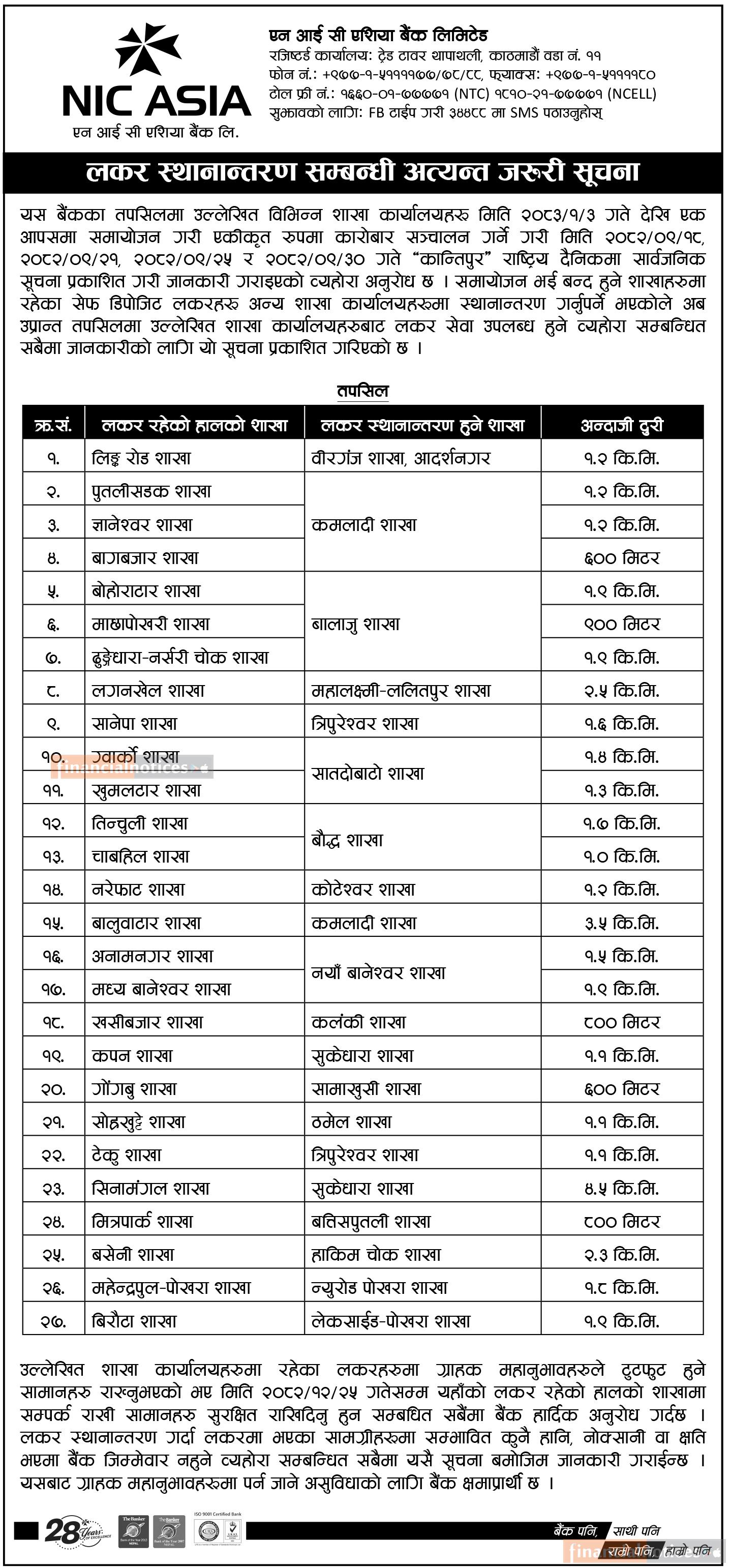 एनआईसी एशिया बैंकको लकर स्थानान्तरण सम्बन्धी सूचना