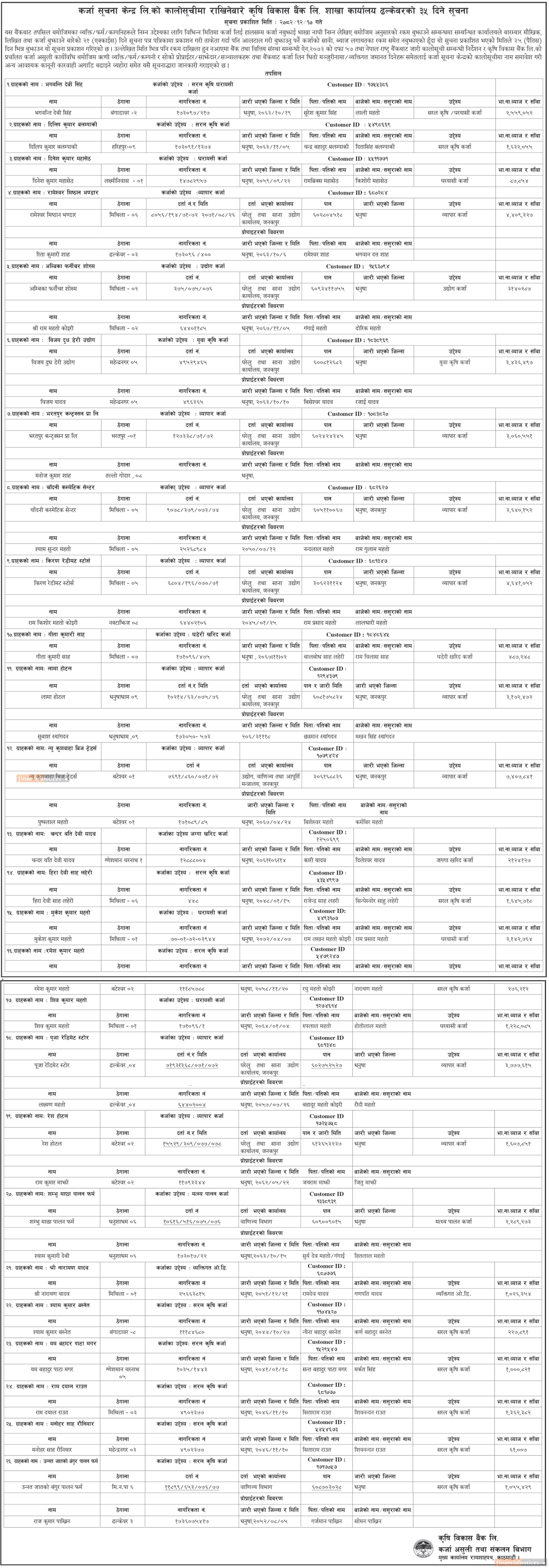 कालो सूचीमा राखिने बारेको कृषि विकास बैंकको जरुरी सूचना