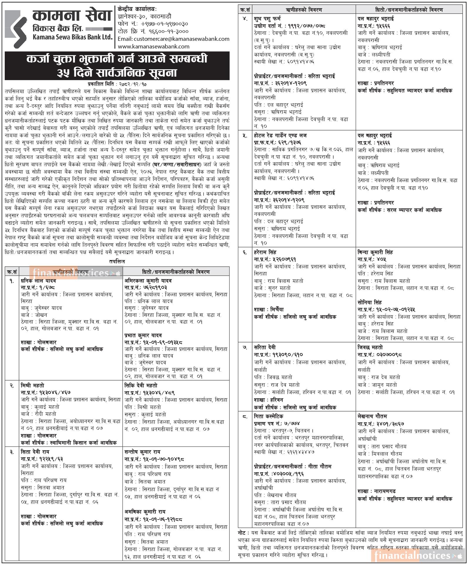 कर्जा चुक्ता भुक्तानी गर्न आउने सम्बन्धी ३५ दिने सार्वजनिक सूचना