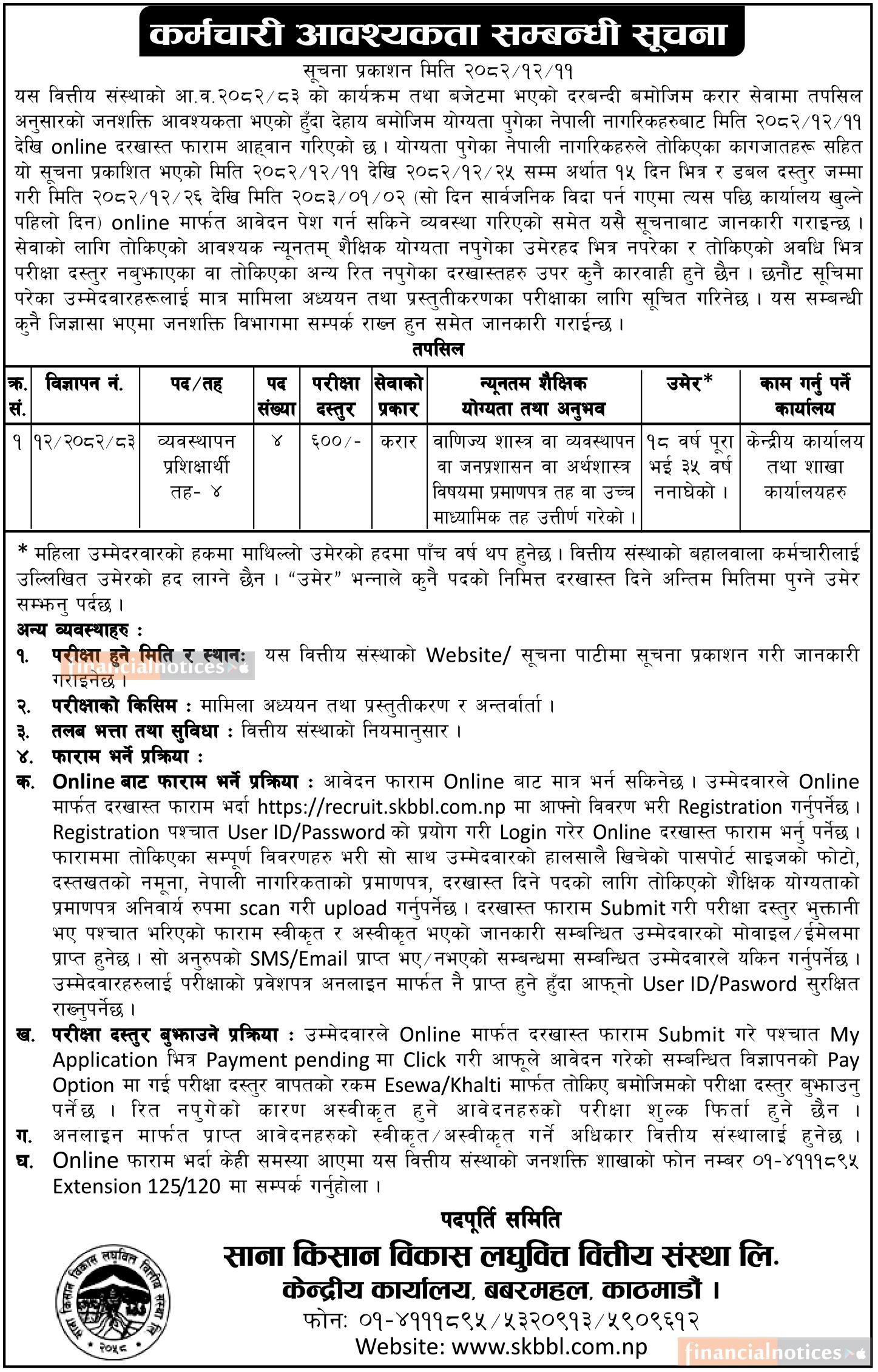 Kathmandu: Sana Kisan Bikas Laghubitta Bittiya Sanstha Ltd. has announced a vacancy for the position of Management Trainee (Level-4) under contract service, as per its annual program and approved staffing structure for the fiscal year 2082/83.