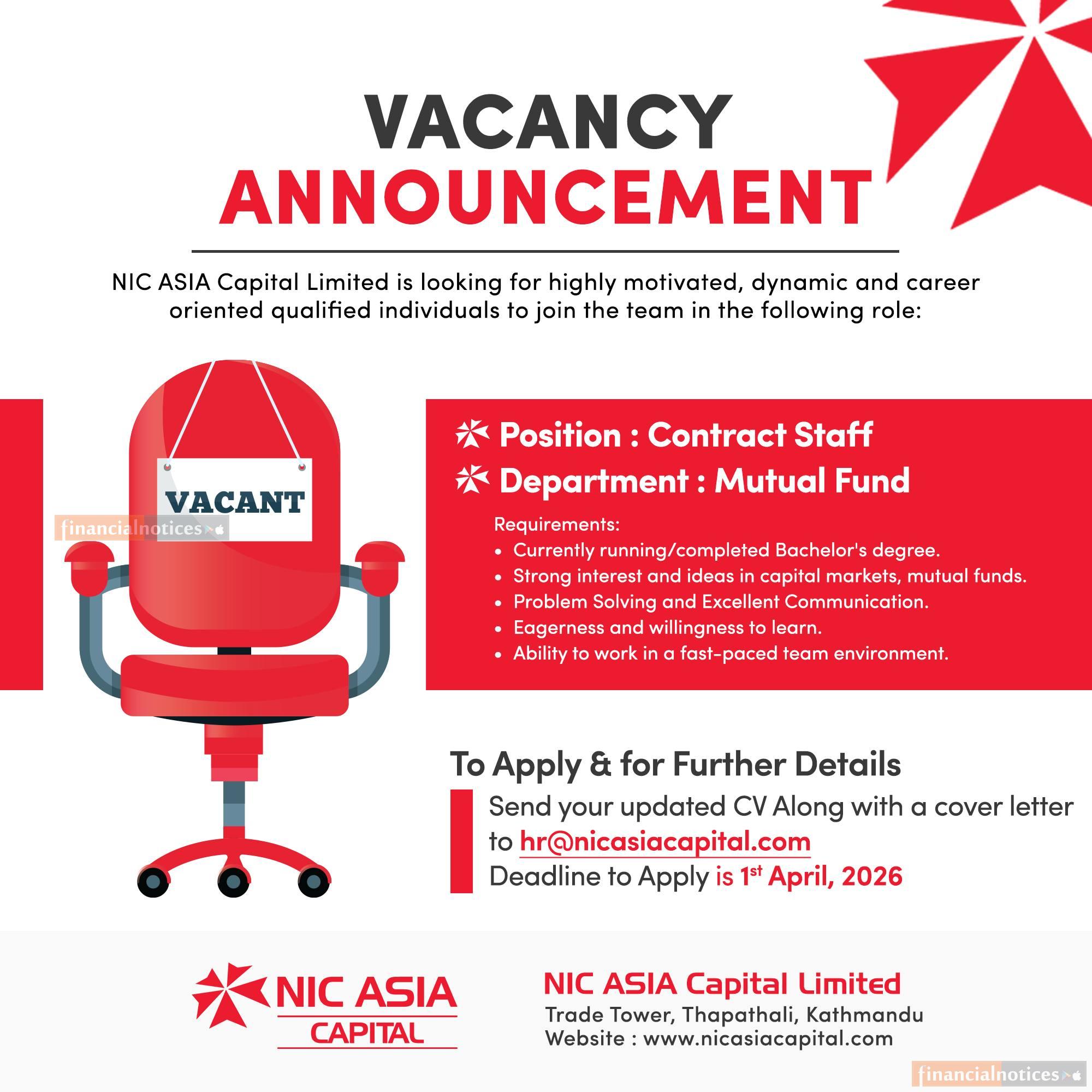 Kathmandu: NIC Asia Capital Limited has announced a vacancy for the position of Contract Staff in its Mutual Fund Department, inviting applications from qualified and motivated individuals.