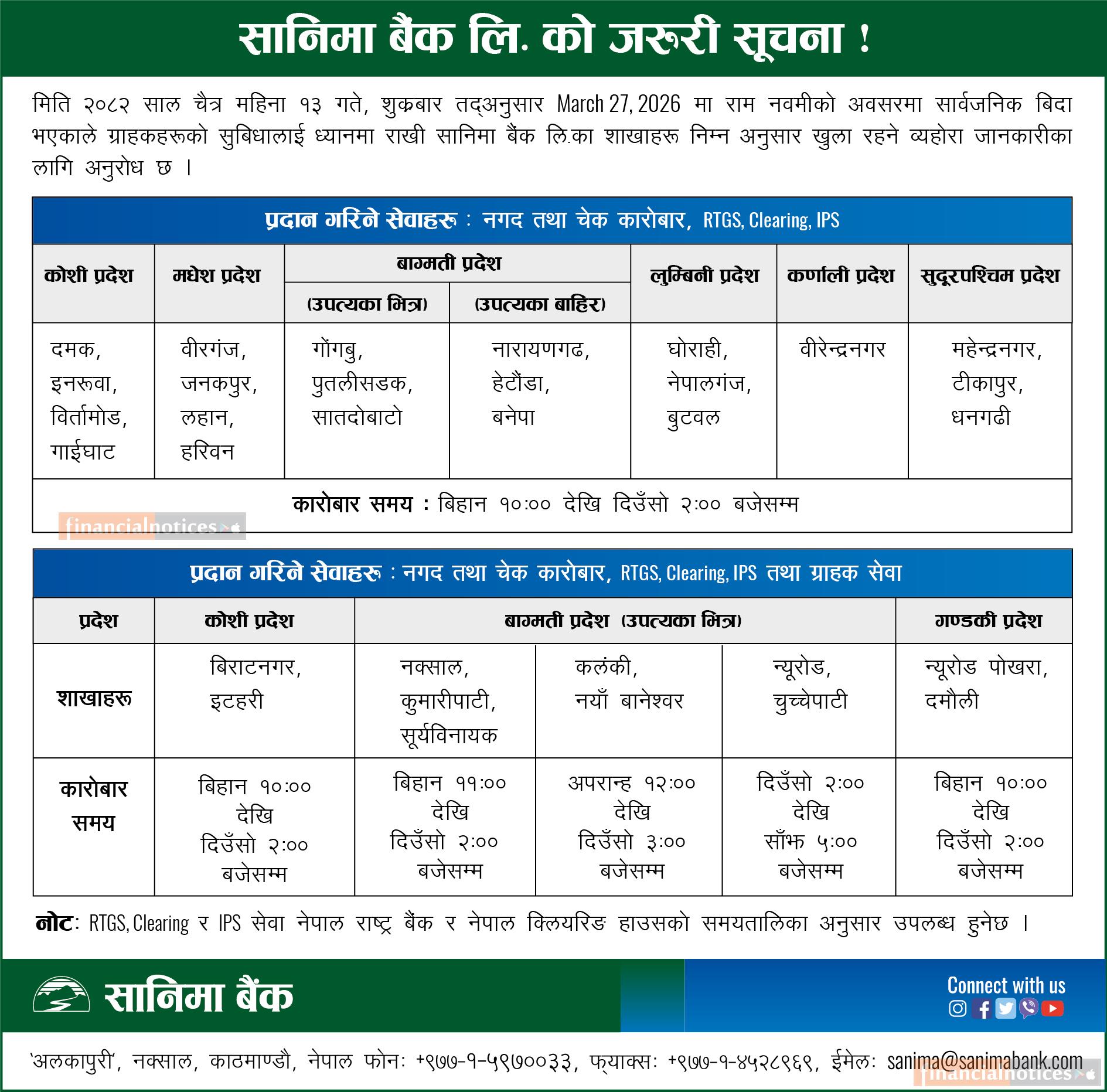 राम नवमीको दिन सानिमा बैंकको शाखाहरु खुल्ला रहने सम्बन्धी सूचना