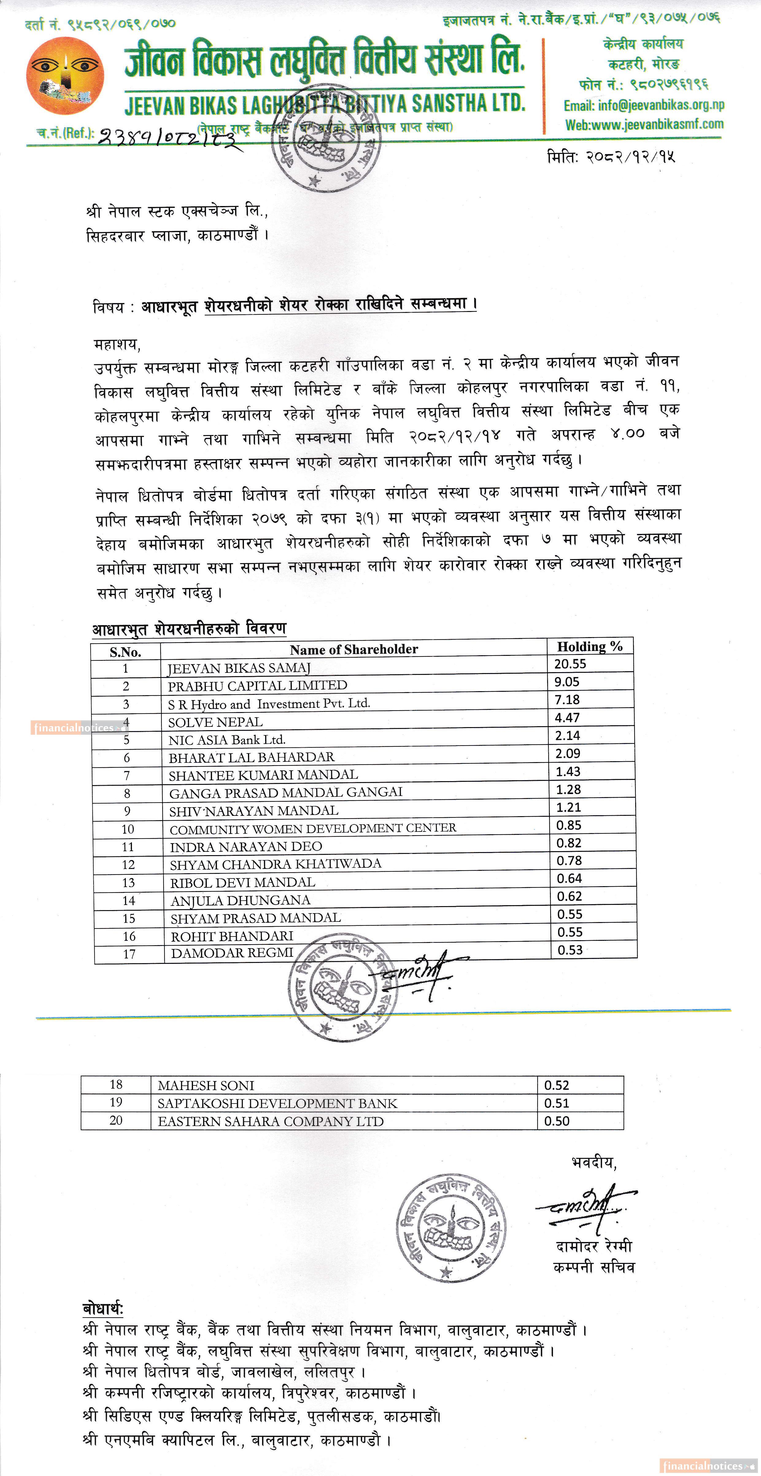 आधारभुत शेयरधनीको शेयर कारोबार रोक्का गरिदिने सम्बन्धी सूचना