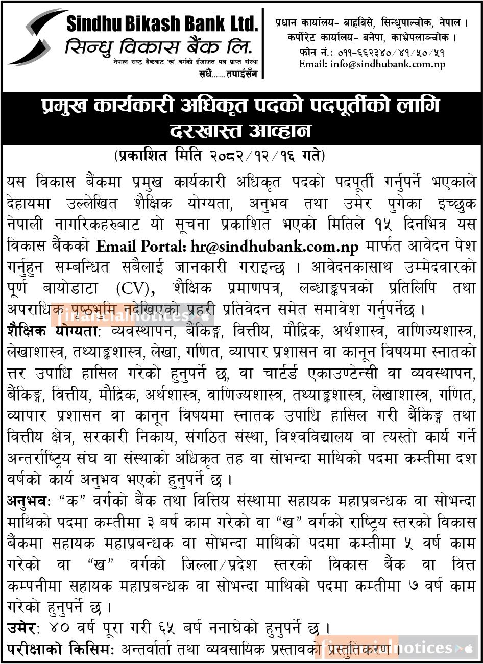 Sindhu Bikash Bank Ltd. has published a vacancy notice inviting applications for the position of Chief Executive Officer (CEO). The announcement was officially released on 2082/12/16 (Nepali date), calling for qualified and experienced Nepali citizens to apply within 15 days from the date of publication.