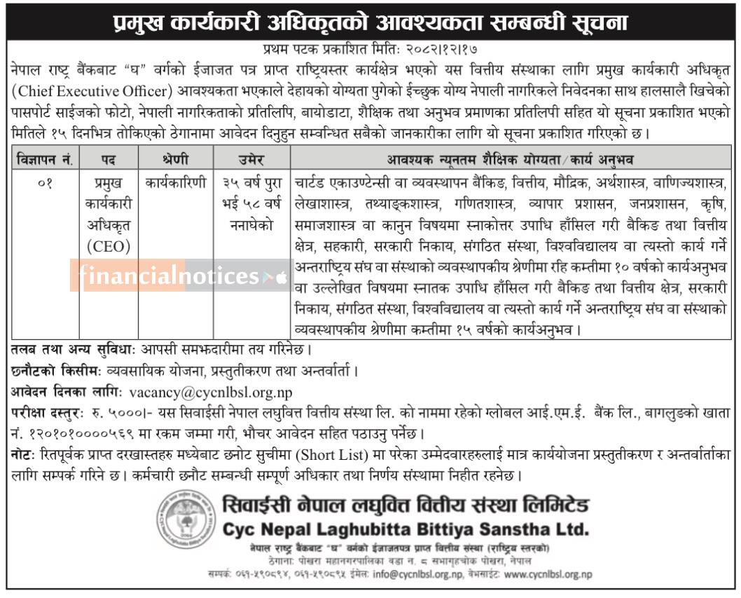 CYC नेपाल लधुवित्तमा कर्मचारी आवश्यकता -