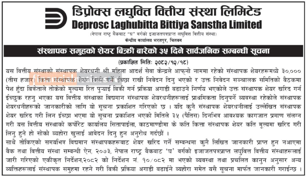 संस्थापक समुहको शेयर बिक्री सम्बन्धी ३५ दिने सूचना