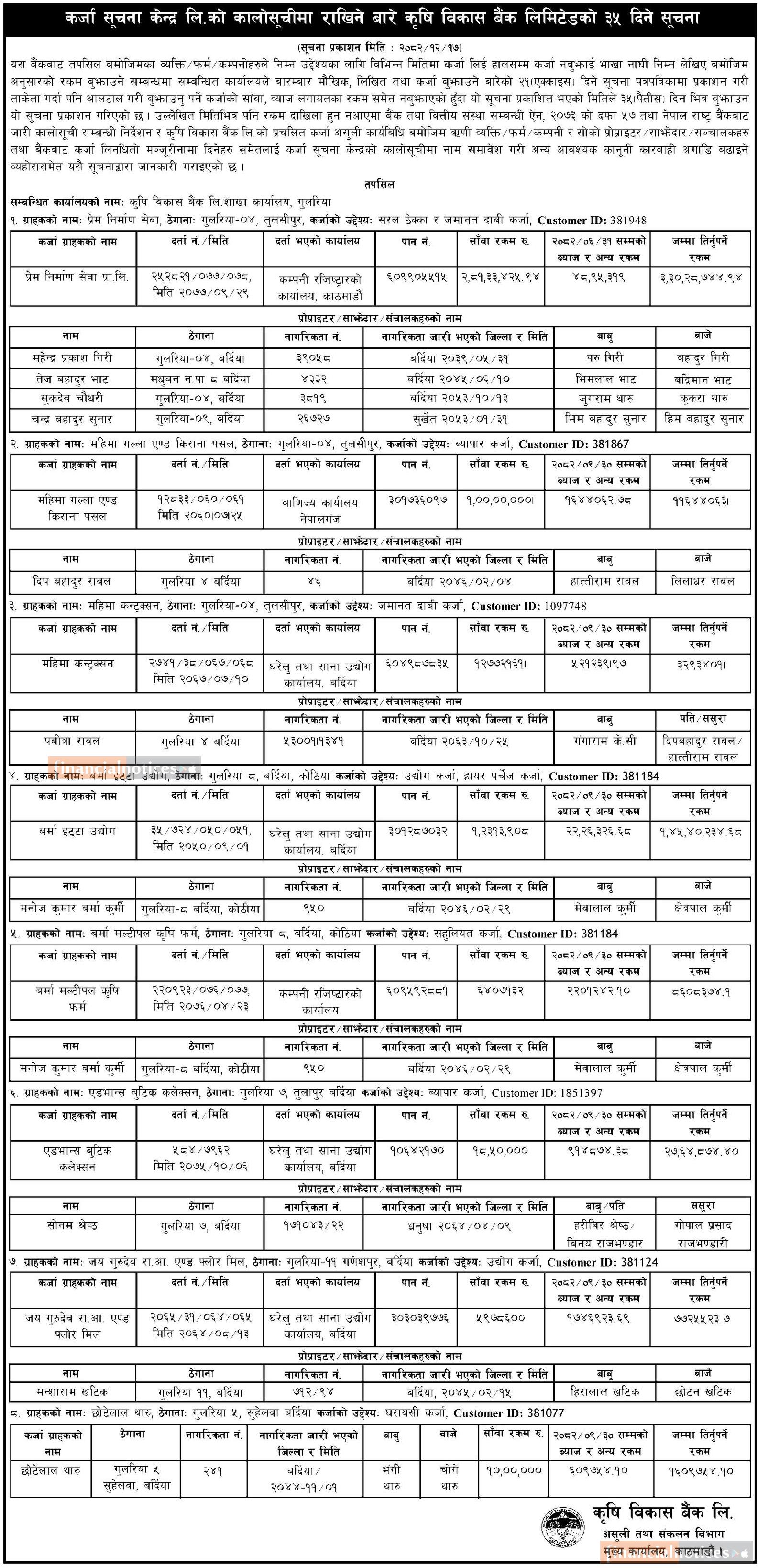 कालो सूचीमा राखिने बारेको कृषि विकास बैंकको ३५ दिने सूचना