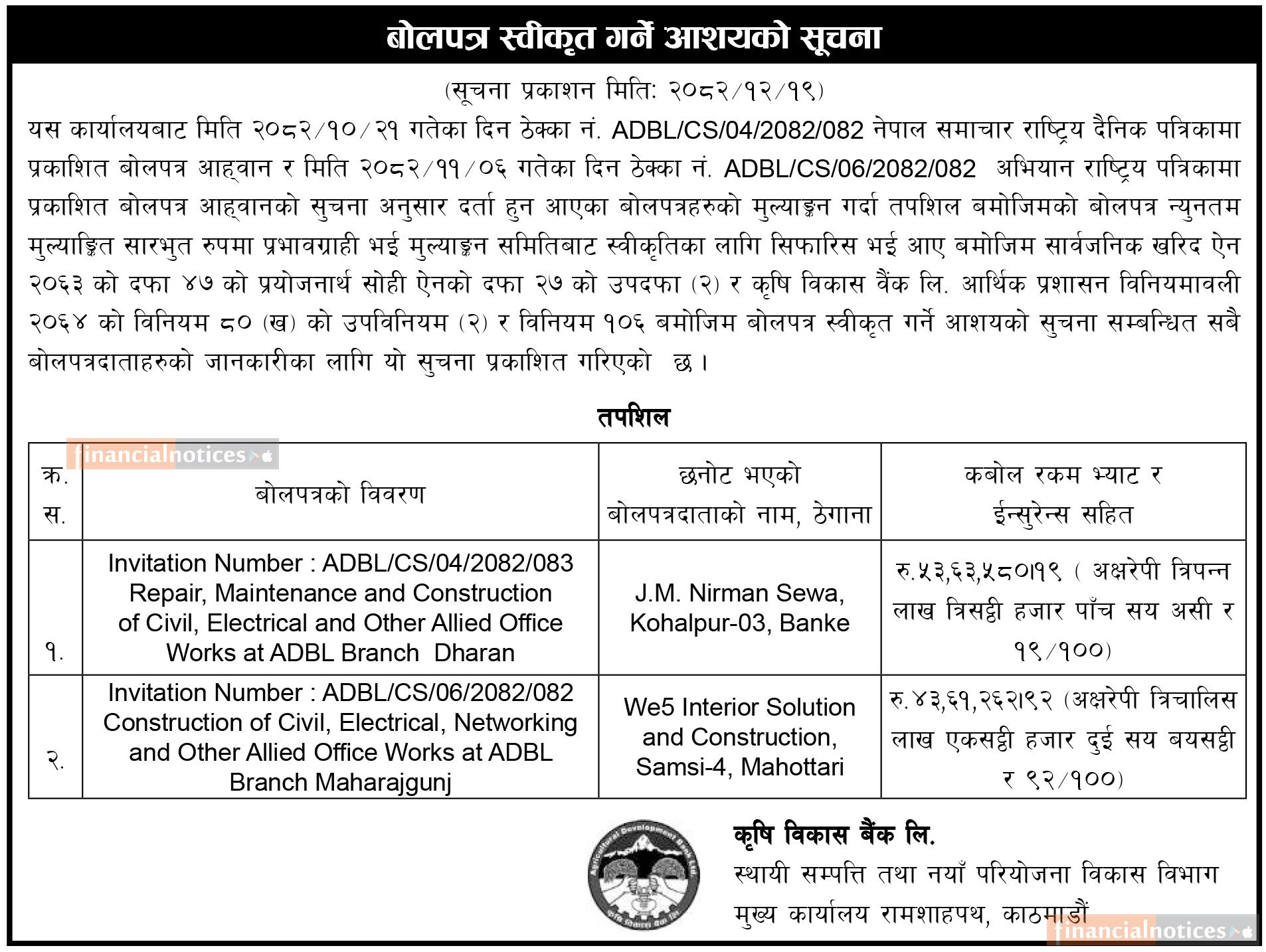बोलपत्र स्वीकृत गर्ने आशयको सूचना
