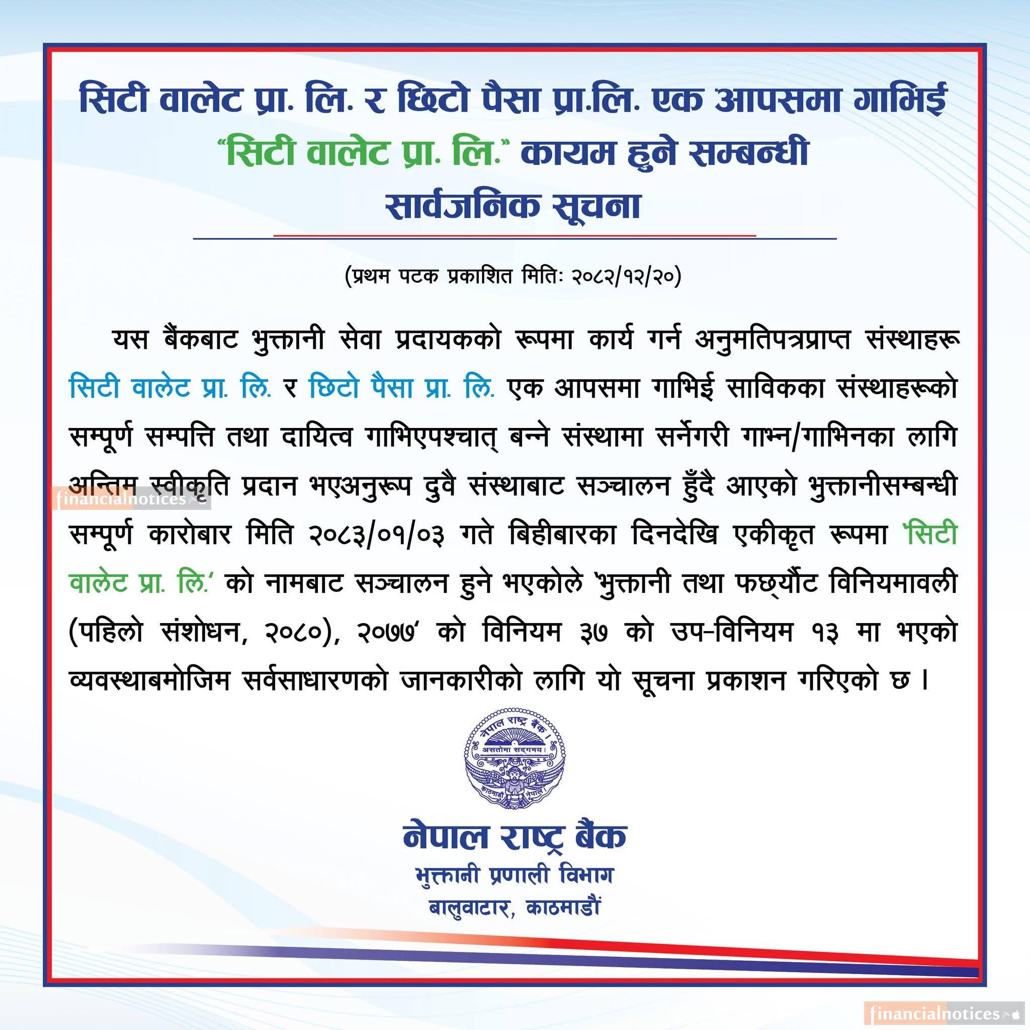 'सिटी वालेट प्रा.लि.' र 'छिटो पैसा प्रा.लि.' एकआपसमा गाभिई 'सिटी वालेट प्रा.लि.' कायम हुनेसम्बन्धी सार्वजनिक सूचना !