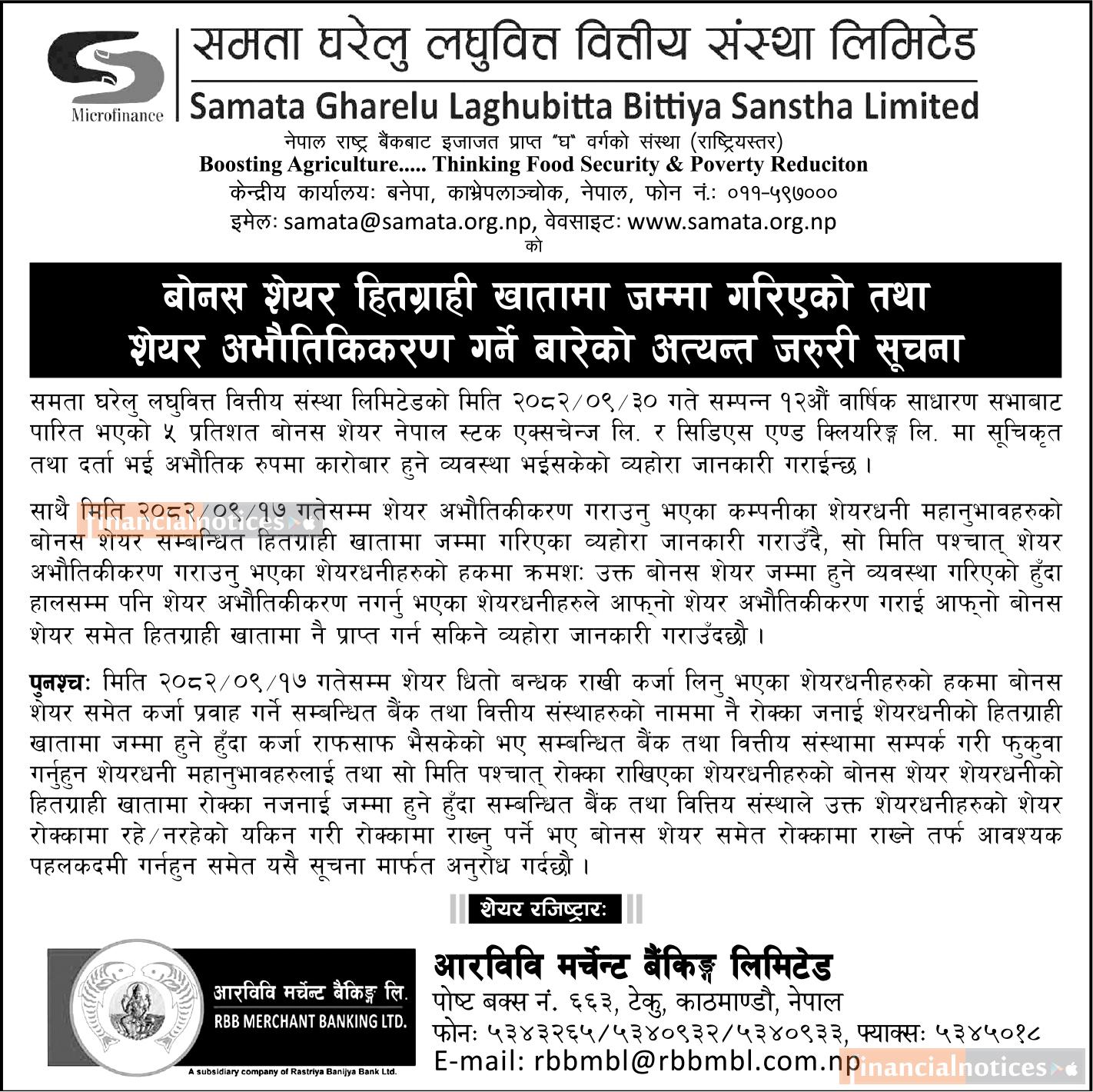 समता घरेलु लघुवित्तको बोनस शेयर हितग्राही खातामा जम्मा सम्बन्धी सूचना