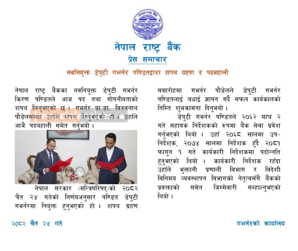 नवनियुक्त डेपुटी गभर्नर किरण पण्डितद्वारा शपथ ग्रहण र पदबहाली सम्बन्धी राष्ट्र बैंकको सूचना