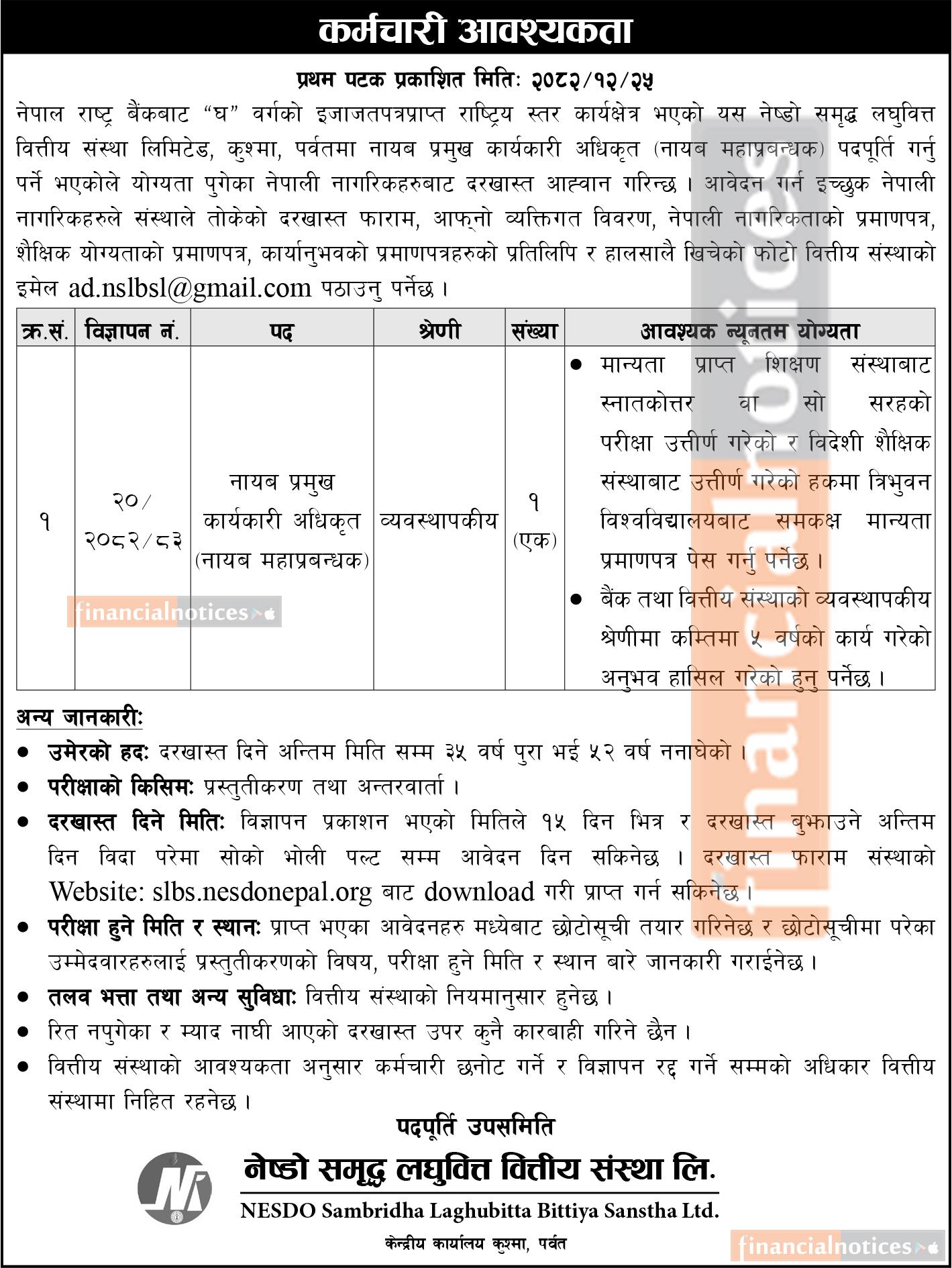 Kathmandu: NESDO Sambridha Laghubitta Bittiya Sanstha Ltd. has published a vacancy announcement seeking qualified and competent candidates for various positions. The microfinance institution, with its central office located in Kushma, Parbat, aims to strengthen its workforce to support its expanding operations.