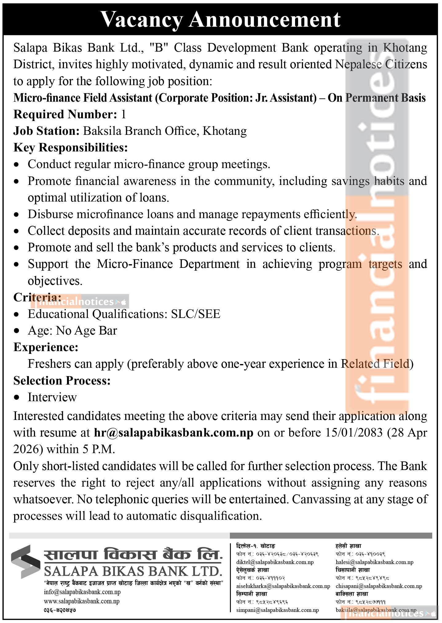 Khotang: Salapa Bikas Bank Ltd., a “B” class development bank operating in Khotang district, has announced a vacancy for the position of Micro-finance Field Assistant (Junior Assistant level) on a permanent basis.