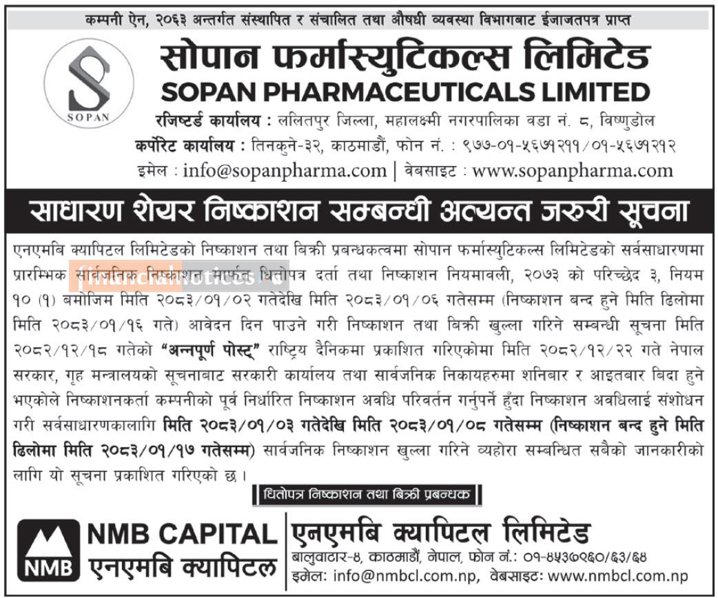 सोपान फर्मास्यूटिकल्सको आईपीओ निष्काशन मिति परिवर्तन सम्बन्धी सूचना