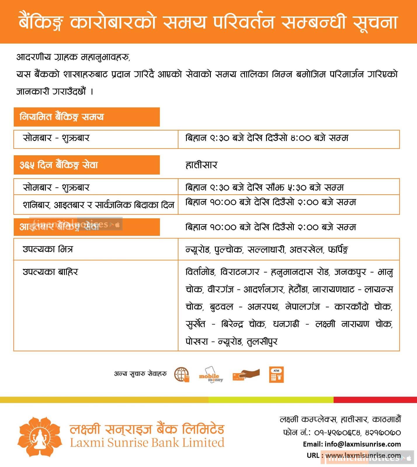 बैंकिङ कारोबार समय परिवर्तन सम्बन्धी लक्ष्मी सनराइज बैंकको सूचना -