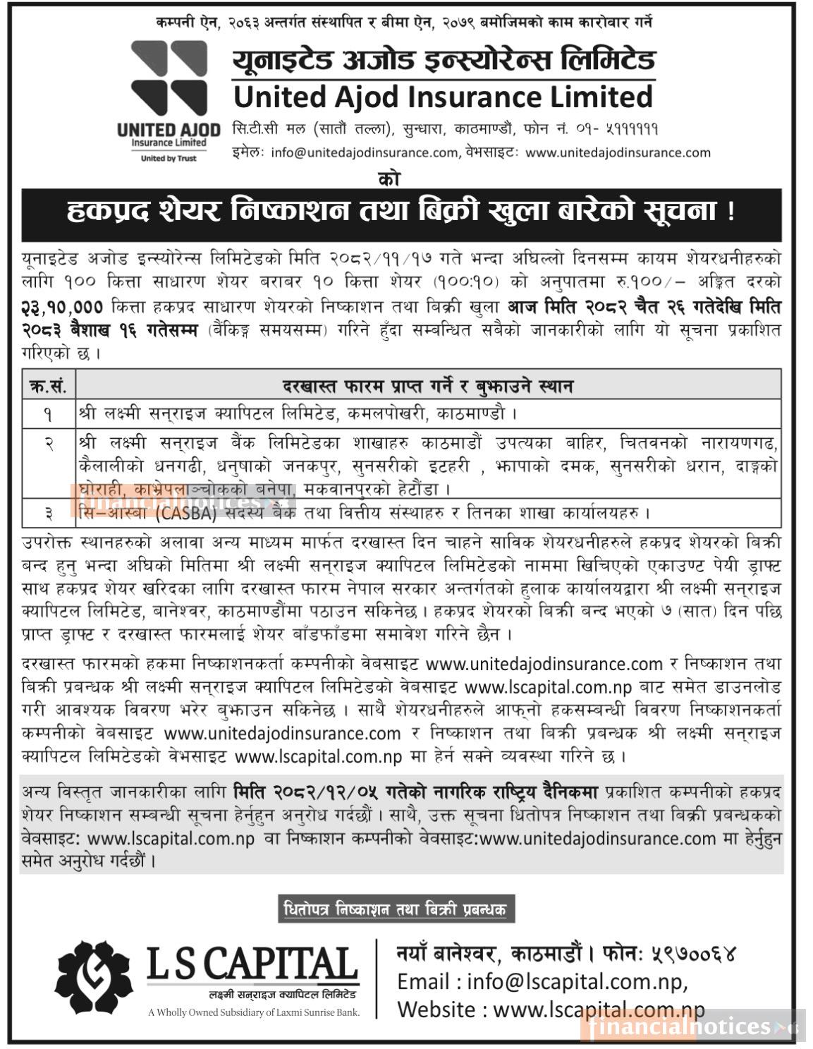 हकप्रद सेयरको बिक्री खुल्ला सम्बन्धी United Ajod ईन्स्योरेन्सको सूचना