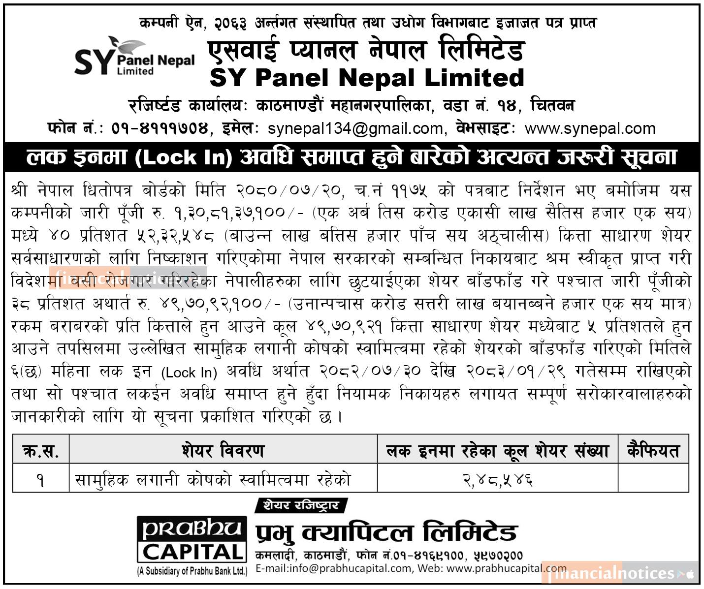 एसवाई प्यानल नेपालको लक इन अवधि समाप्त हुने सम्बन्धी सूचना