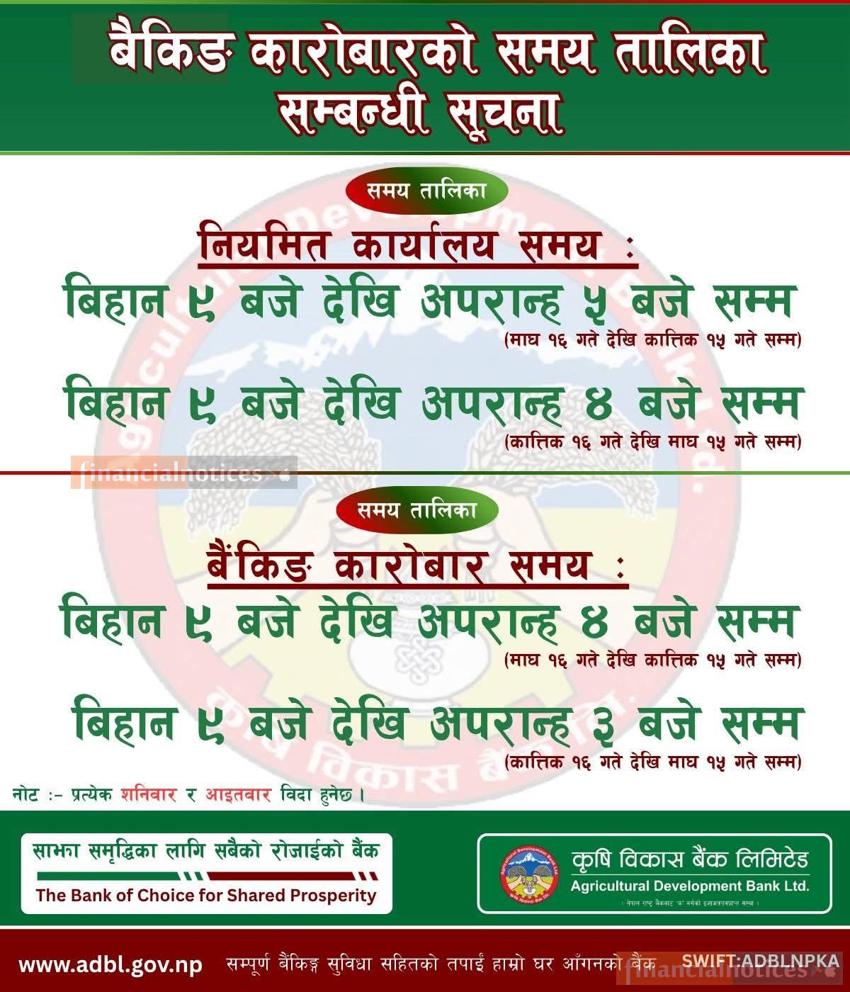 बैंकिङ कारोबार समय तालिका सम्बन्धमा कृषि विकास बैंकको नयाँ सूचना