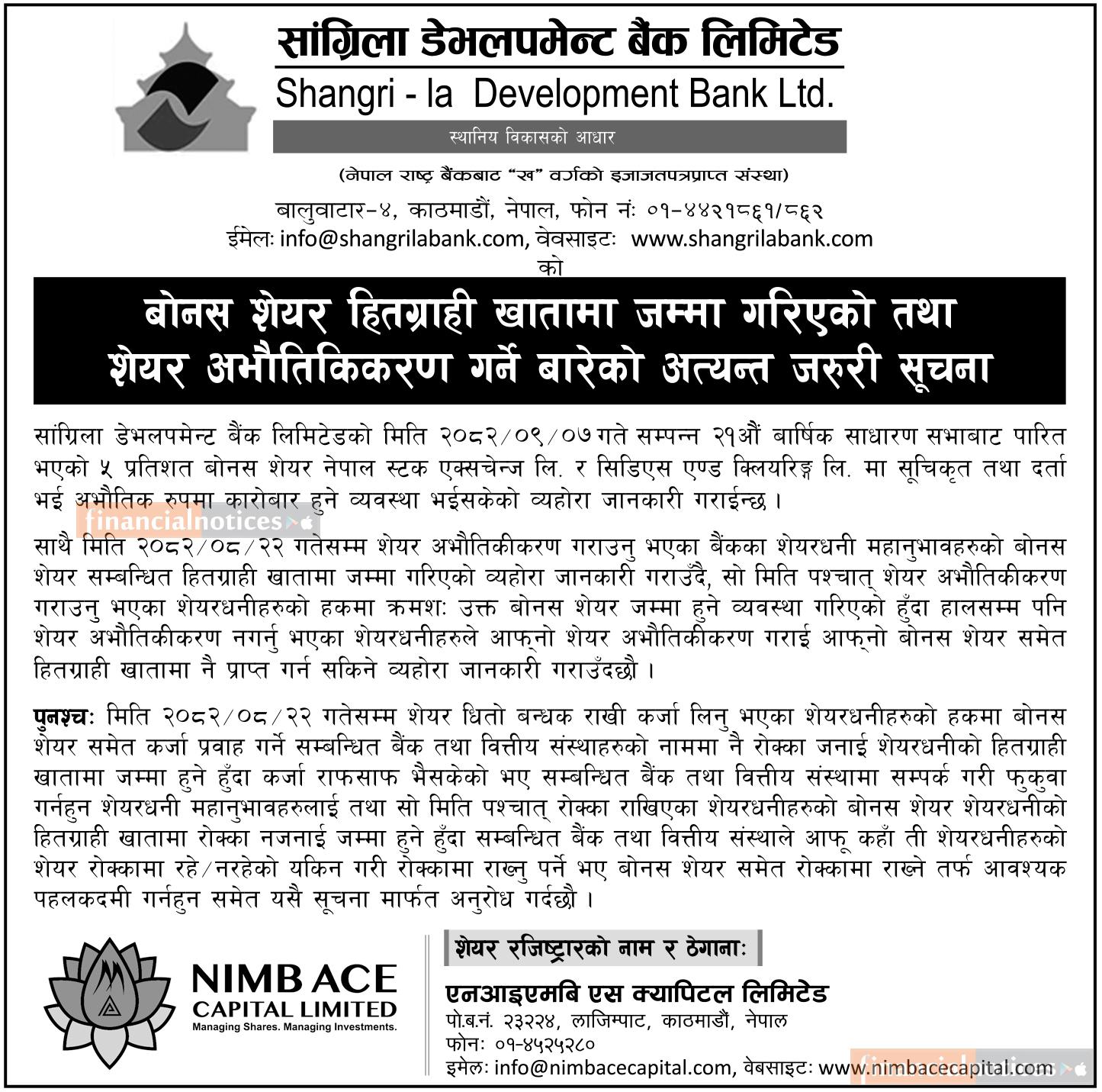 सांग्रिला डेभलपमेन्ट बैंकको बोनस शेयर हितग्राही खातामा जम्मा, शेयर अभौतिकीकरण गर्न आग्रह