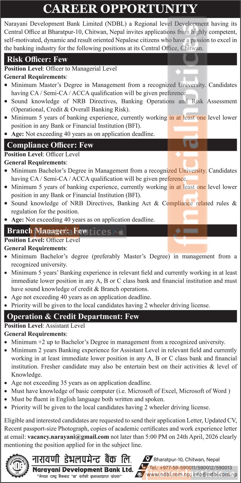 Chitwan: Narayani Development Bank Limited (NDBL), a regional-level development bank with its central office in Bharatpur-10, Chitwan, has opened vacancies for several positions, calling applications from qualified and experienced Nepali candidates.
