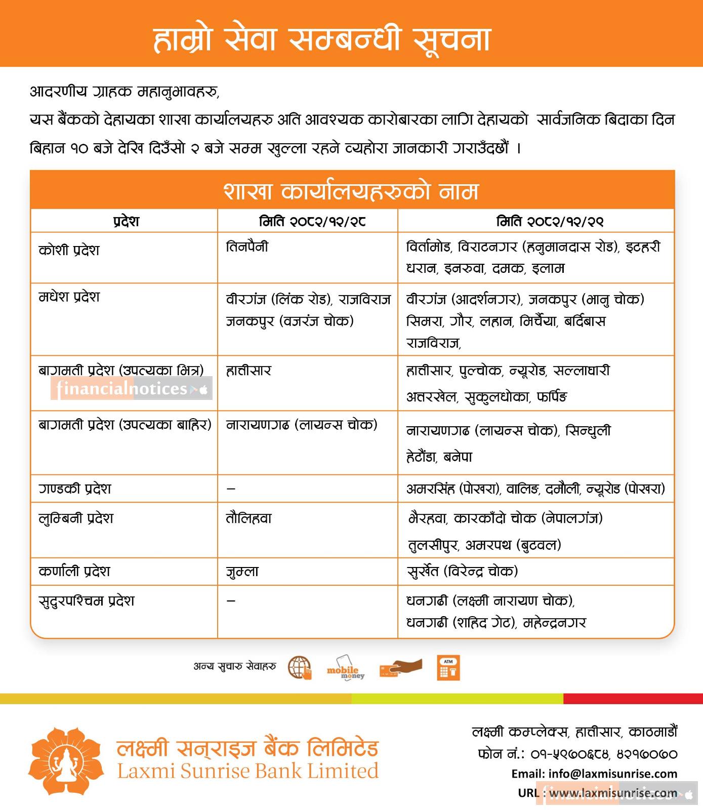 Laxmi Sunrise Bank Announces Branch Opening on Public Holiday -