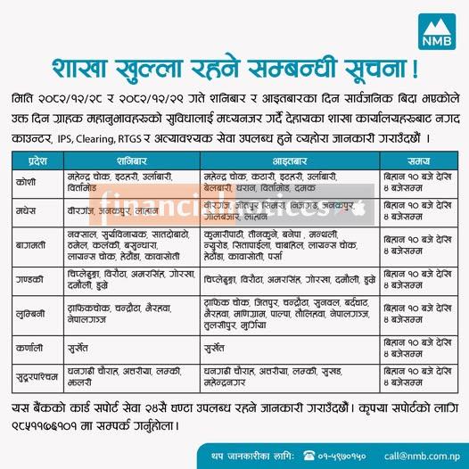 कृषि विकास बैंककाे शाखा कार्यालय खुल्ला रहने बारेकाे सूचना -