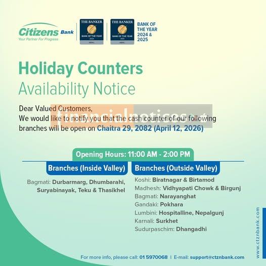 Citizens Bank Announces Counter Service Availability on Public Holidays -