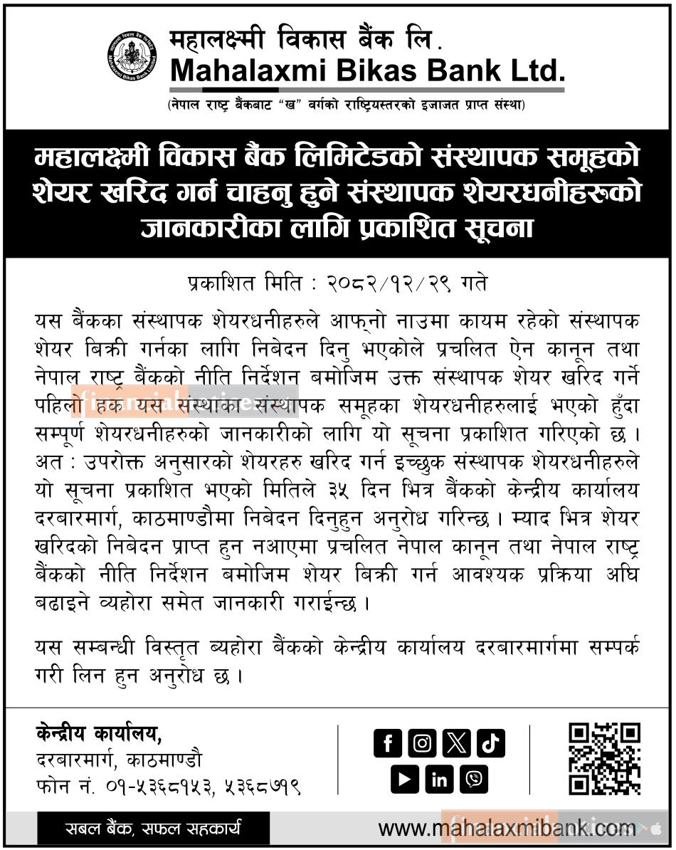 संस्थापक शेयरधनीका लागि शेयर खरिद गर्ने अवसर: महालक्ष्मी विकास बैंकको सार्वजनिक सूचना