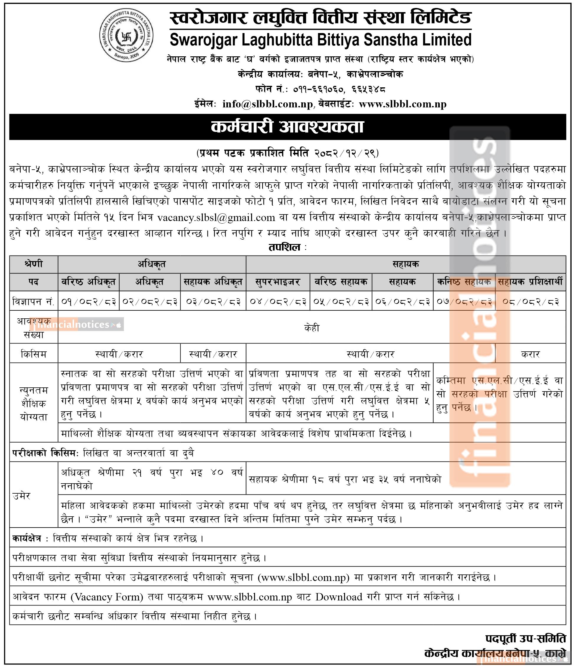 Swarojgar Laghubitta Bittiya Sanstha Limited has announced job vacancies for various positions to strengthen its human resources across its branches and central office. The microfinance institution has invited applications from eligible and motivated Nepali citizens.