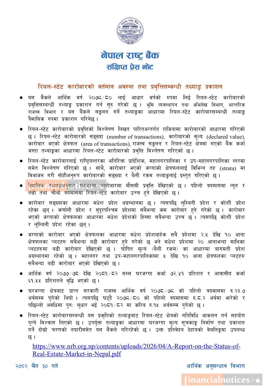 नेपाल राष्ट्र बैंकको रियल–स्टेट कारोबारको वर्तमान अवस्था तथा प्रवृत्तिसम्बन्धी तथ्याङ्क प्रकाशन